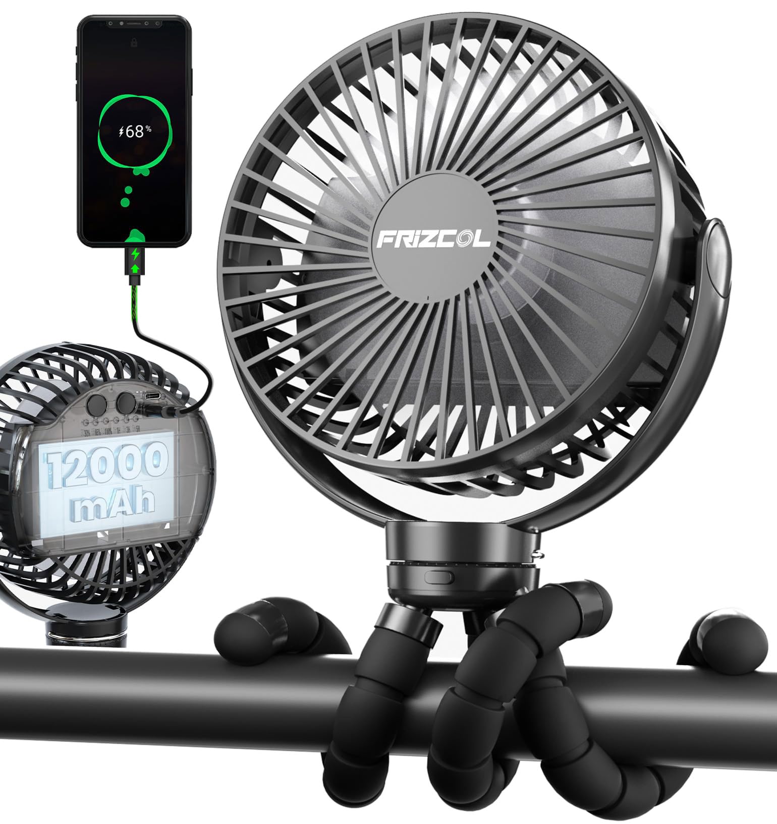 FRIZCOL Portable Stroller Fan, Use As Power Bank, 65H 12000mAh Battery Operated Fan Flexible Tripod Baby Car Seat Fans with Timming, Personal Mini Handheld/Desk/Small Clip On Fans For Stroller