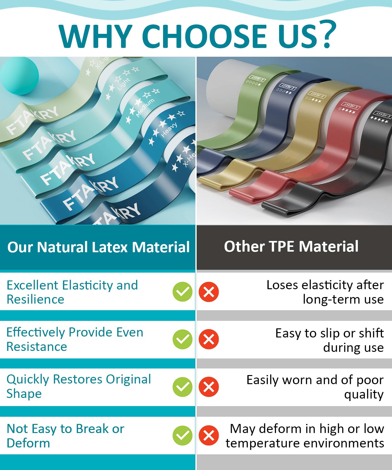• 【Premium Material】The exercise bands are made of high-quality natural latex, which has excellent elasticity and resilience, allowing it to effectively provide even resistance and quickly return to its original shape after use.