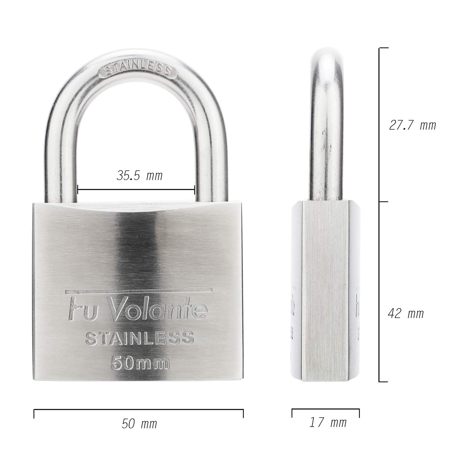 Fu Volante Stainless Steel Pin Tumbler Padlock, 304 Marine Series, Weatherproof Padlock for Outdoor use, 2 inch Wide Body, Keyed Different - Stainless Steel Body & Shackle