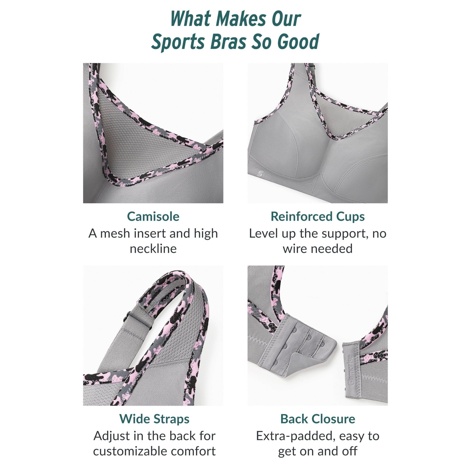 • CAMISOLE: A breathable mesh camisole design provides upper bust containment and bounce control.