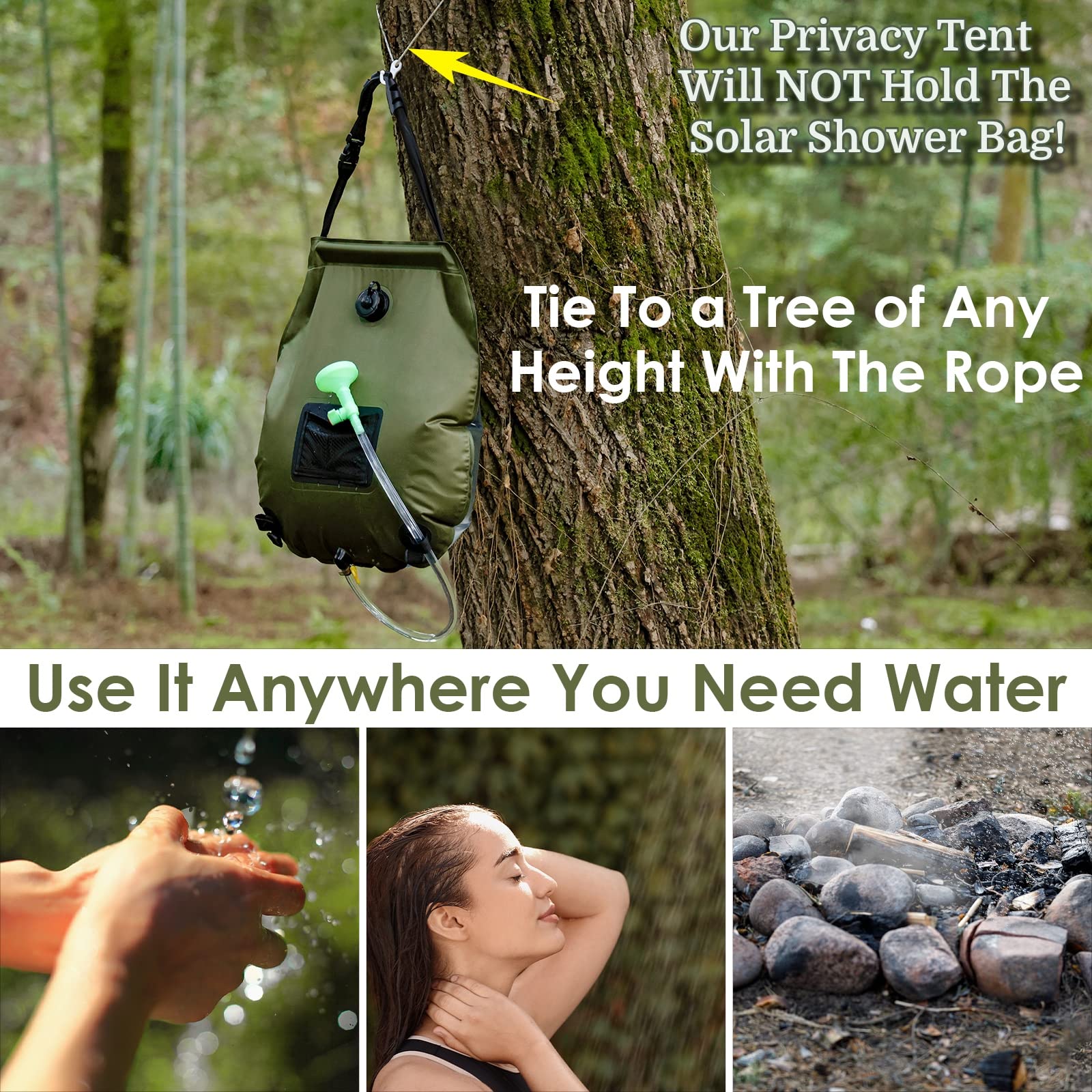 • ✅Upgraded shower tent is compatible with any solar shower bags - No more trying to hang your shower bag to a tall tree branch! This kit comes with a hanging rope with a hook. Simply tie your solar shower bag with your desired height on a tree, the shower nozzle can come through the side windows with different heights of this tent.