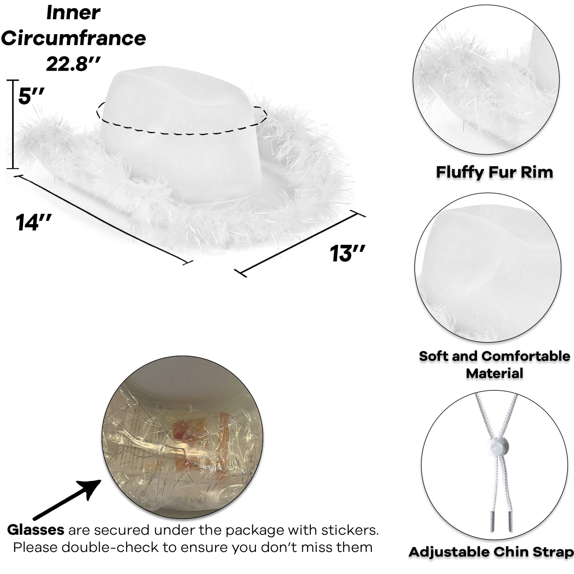 Funcredible White Cowboy Hat and Glasses - Fluffy Cowgirl Hat with Star for Girls - Cowboy Hat with Feathers - Cowgirl Accessories - Halloween Accessories for Women