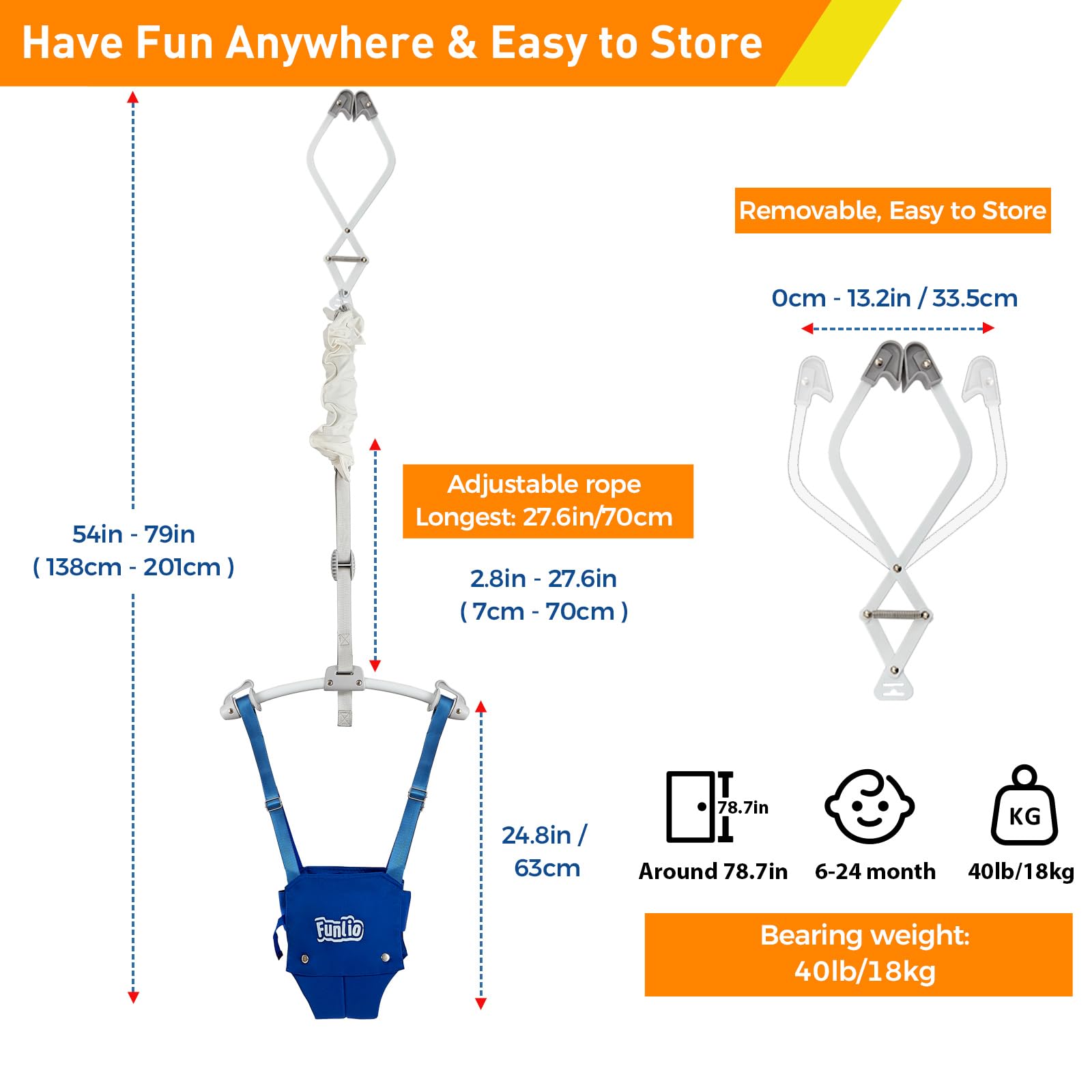 • 【Endless Hours of Fun】FUNLIO adjustable baby door jumper is designed for babies 6-24 months, and weighing under 40 lbs. The well-designed door jumper seat bag can firmly support the baby's spine, ensuring correct, upright posture during bouncing. All you need is a suitable doorframe, and your baby can play safely within the room. This baby jumper doorway will help babies improve balance and exercise muscles, and let your little one enjoy a happy childhood.