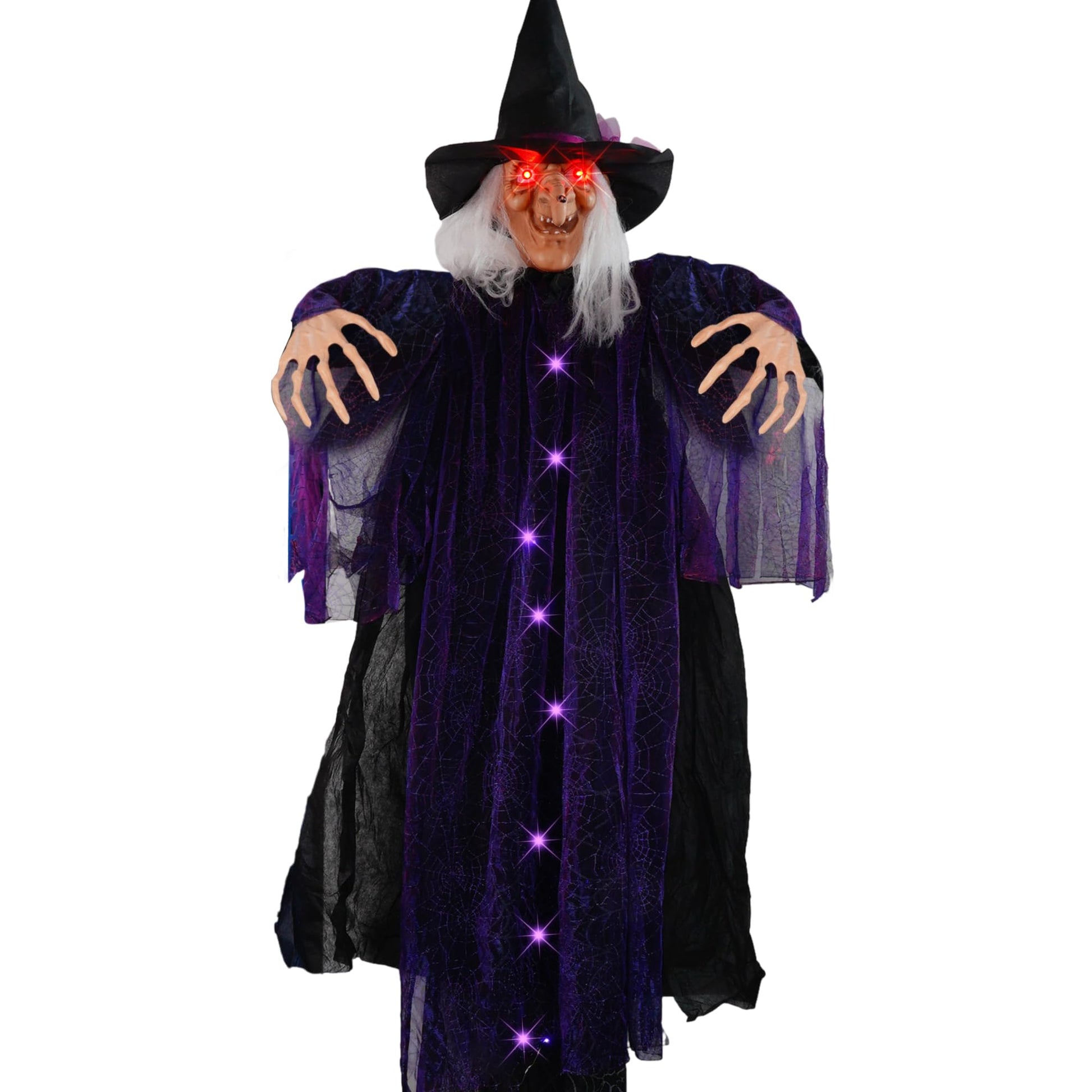 • Twinkle Eyes & Purple Lights: The hanging witch has black and purple clothes. Design with a glowing red eyes, and all body wrap with the purple lights, which can make a mystery vibe for your home, glowing the red eyes on the dark, your guest will must be attract and give them suprise.