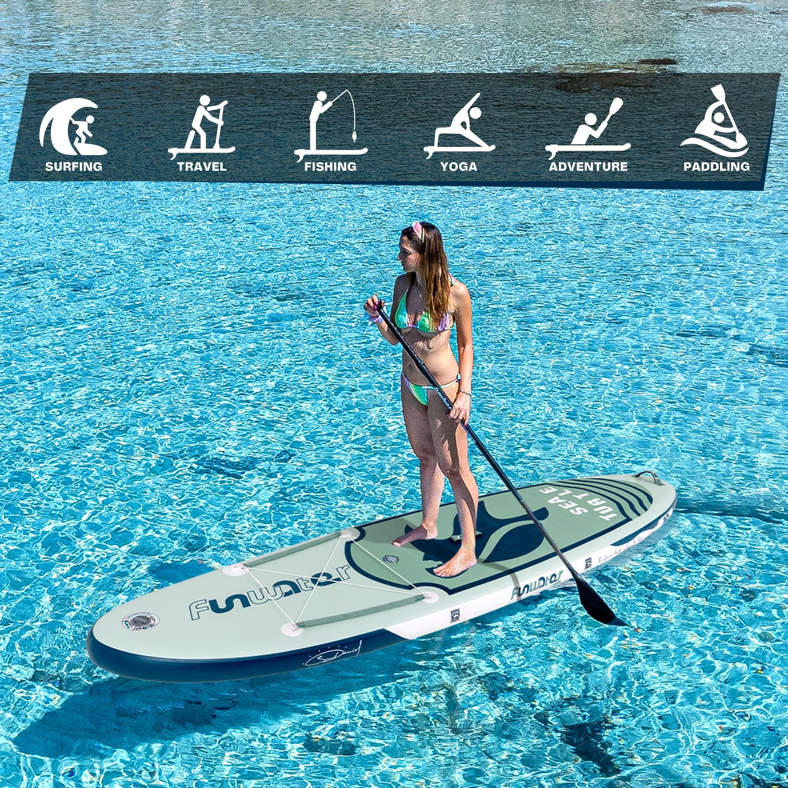 • From the design to the production process, FunWater ensures that every detail of the ISUP meets high standards. Features non-slip EVA decking for excellent durability, slip resistance and comfort. Comes with a high quality pump, the paddle board can be easily deflated and rolled up for easy storage and transport. You can bring along your children and pets, making it perfect for various activities such as yoga, fishing, and sunbathing.