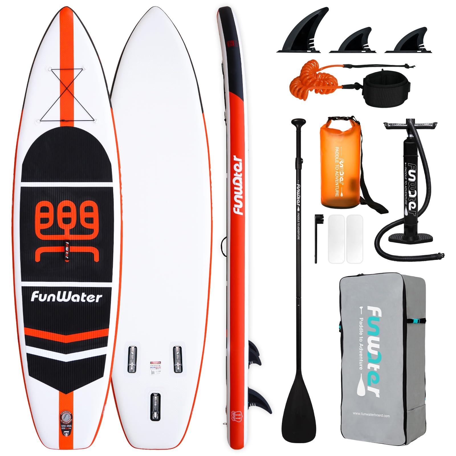 • 【Design and Use】Stand up paddle board are constructed with anti-slip EVA deck for maximum durability, slip-resistance, and comfort. Funwater's unique ergonomic handle design allows you to inflate your paddle more easily in a shorter time. The sensitive barometer ensures that you can read the sup inflation pressure value (12-15psi) at any time. The multifunctional elastic string can tightly fix any objects placed on the inflatable paddleboard.