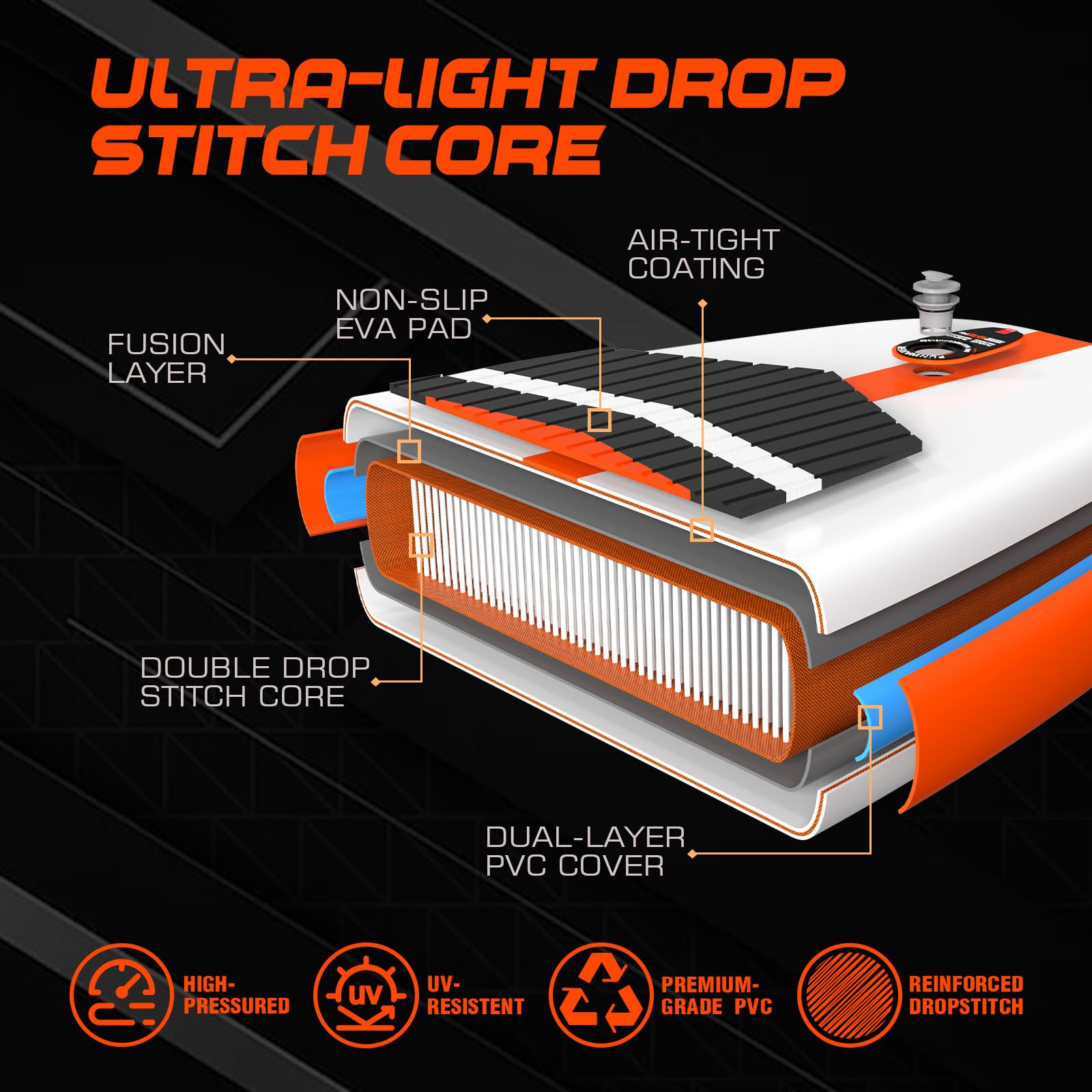• 【Materials and Parameters】The new ultra light grade double wall PVC is 35% lighter than similar size products , with excellent wear resistance, toughness and long service life. The inflatable paddleboards standard size is 11'x 33' x 6 ', carrying 400 pounds.