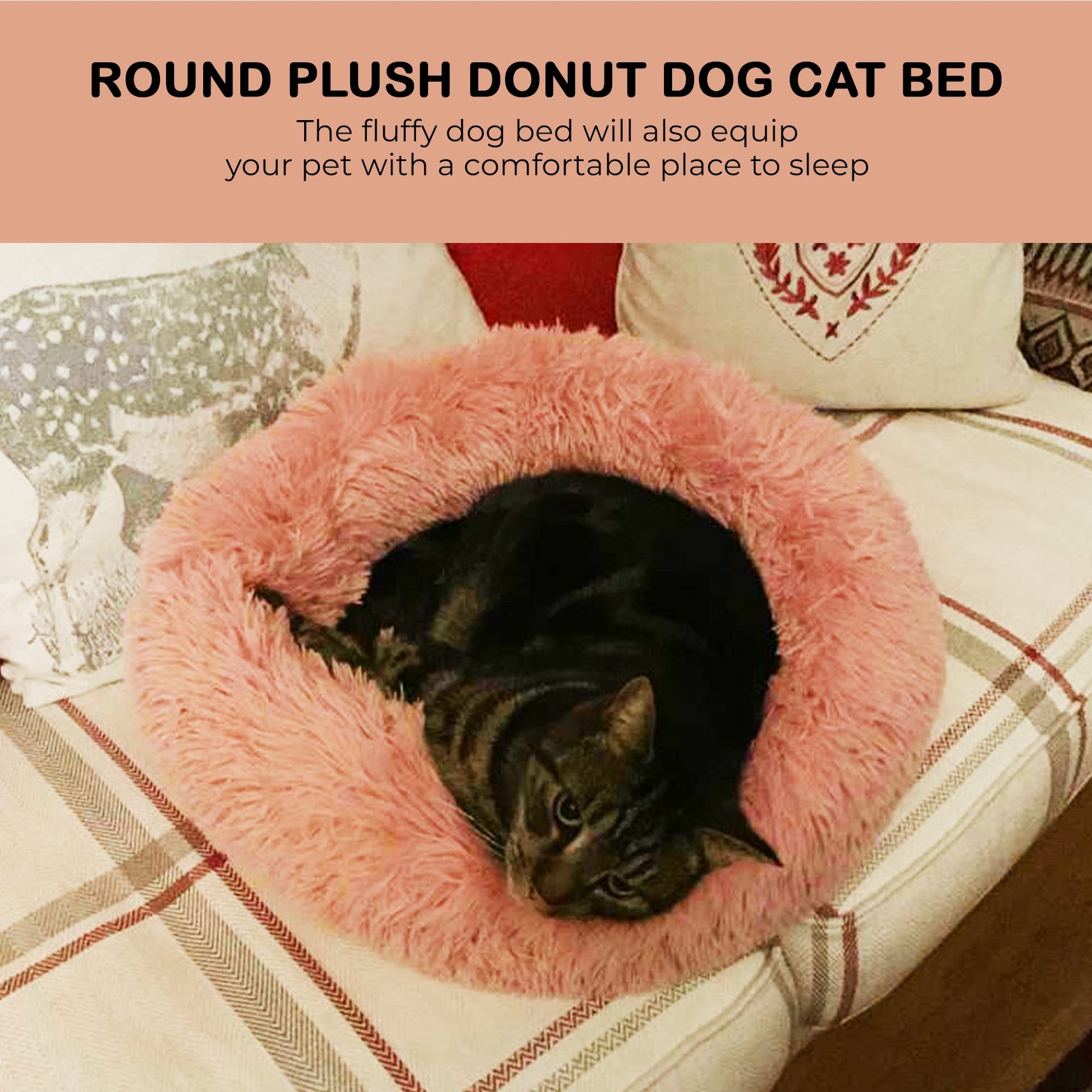 Fur & Bone Round Plush Donut Dog Cat Bed | Fluffy Cuddler Pet Cushion Self-Warming Beds | Washable Dog Bed with Non-Slip and Waterproof Bottom Calming Dog Bed - (60cm, Pink)