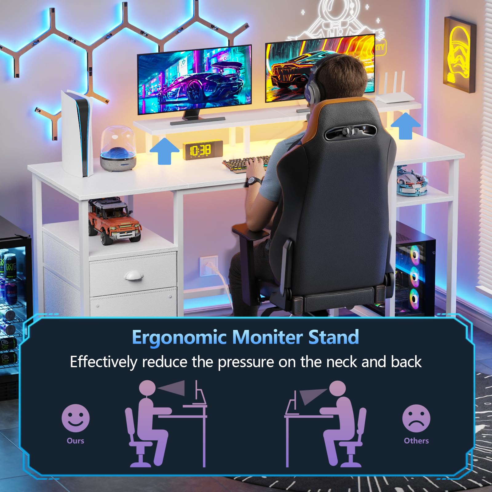 Furologee 61" Desk with LED Light & Power Outlets, Reversible Computer Table with File Cabinet & Drawer, White Gaming Desk Writing Table with Dual Monitor Stand, for Home/Office/White