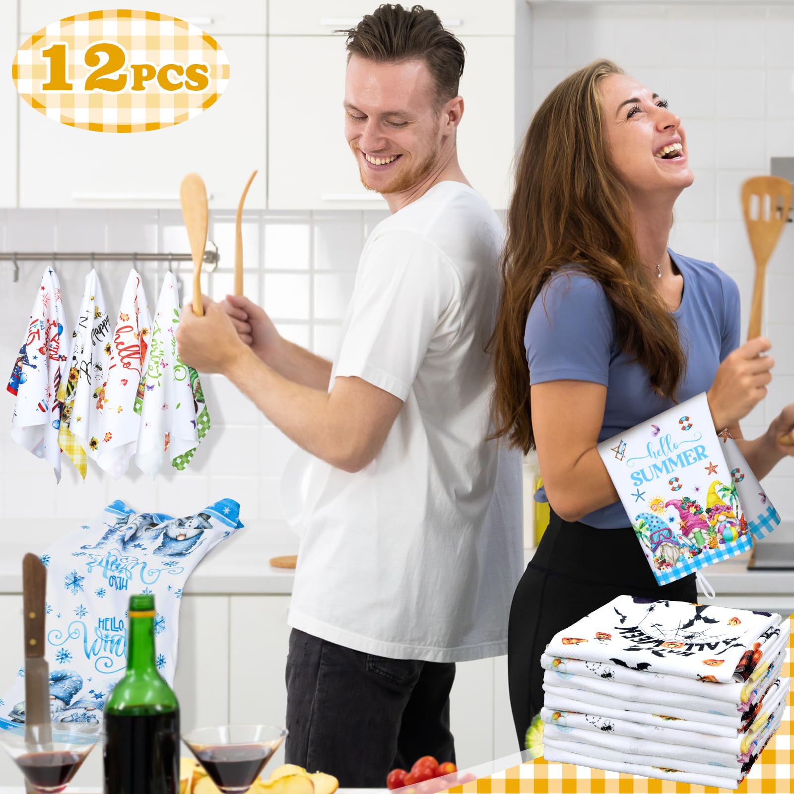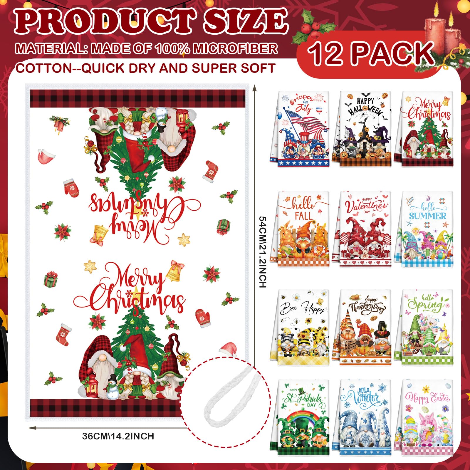 FuWeave 12 Pcs Seasonal Kitchen Towels Set for All Holidays Hand Dish Tea Towels Fall Halloween Christmas Absorbent Dishcloths Housewarming Gift for Cooking Kitchen Bathroom(Gnome Style,Bright Color)