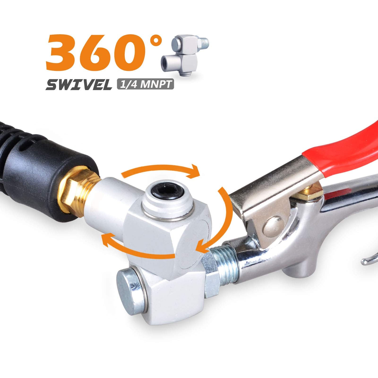 • ➤ Universal Accessories and Attachments – We’ve also provided all the small details to suit your air compressor needs, including tire inflator gauge, 360° swivel connector, swivel plugs, heavy duty blow gun with safety and tapered nozzles, rubber tip, couplings & plugs, and PTFE tape.