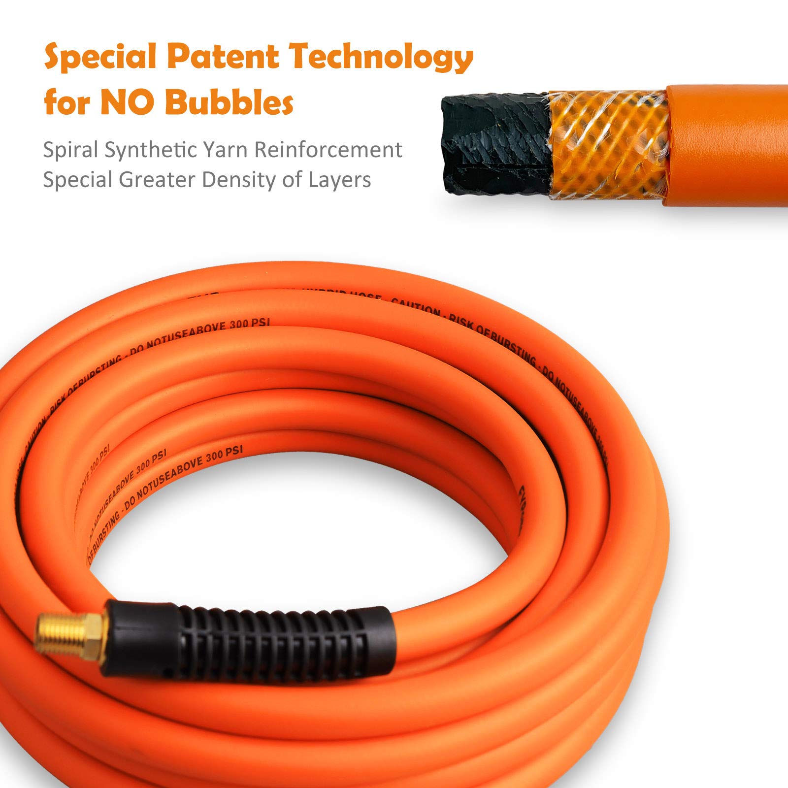 • ➤ Flexible, Lightweight Hybrid Air Hose – Offering more control and versatility over a standard air compressor hose, our 3/8” x 25ft hybrid hose with ¼” FNPT and MNPT couplers offers 300 PSI of stable pressure.