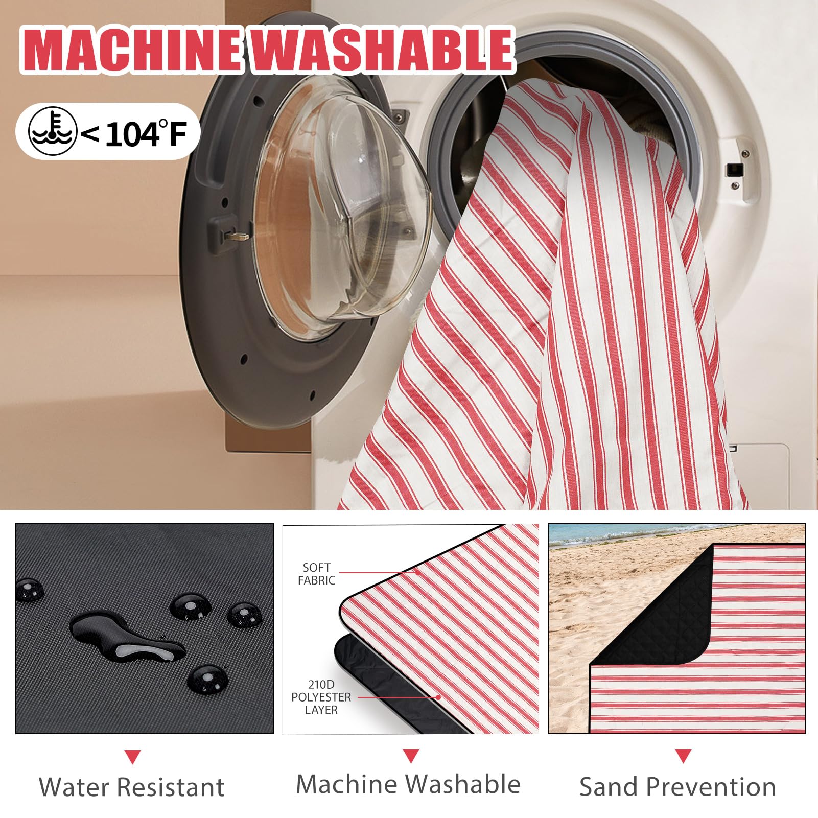Machine Washable & Easy to Clean - Adopting heavy duty canvas, cycle machine washing does not run cotton, machine washable below 104℉/40℃,compare with other HAND WASH OR SPOT CLEAN picnic blanket, it’s cleaner and saves much of your time, and. It is easy to shake off sand from a beach blanket
