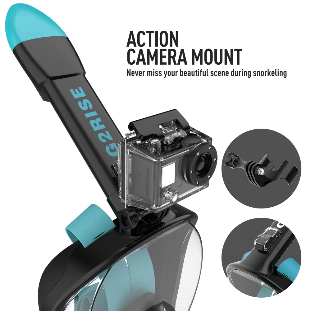 • [UNOBSTRUCTED 180°VIEW AND SUPPORT CAMERA MOUNT] G2RISE snorkel mask offers a curved lens that extends behind your eyes and provides a clear uninterrupted 180-degree view and the ability to breathe through your nose and mouth, it's never been easier to discover the underwater world. The detachable camera mount allows you easily attach your camera to capture and share your adventure with friends and family.