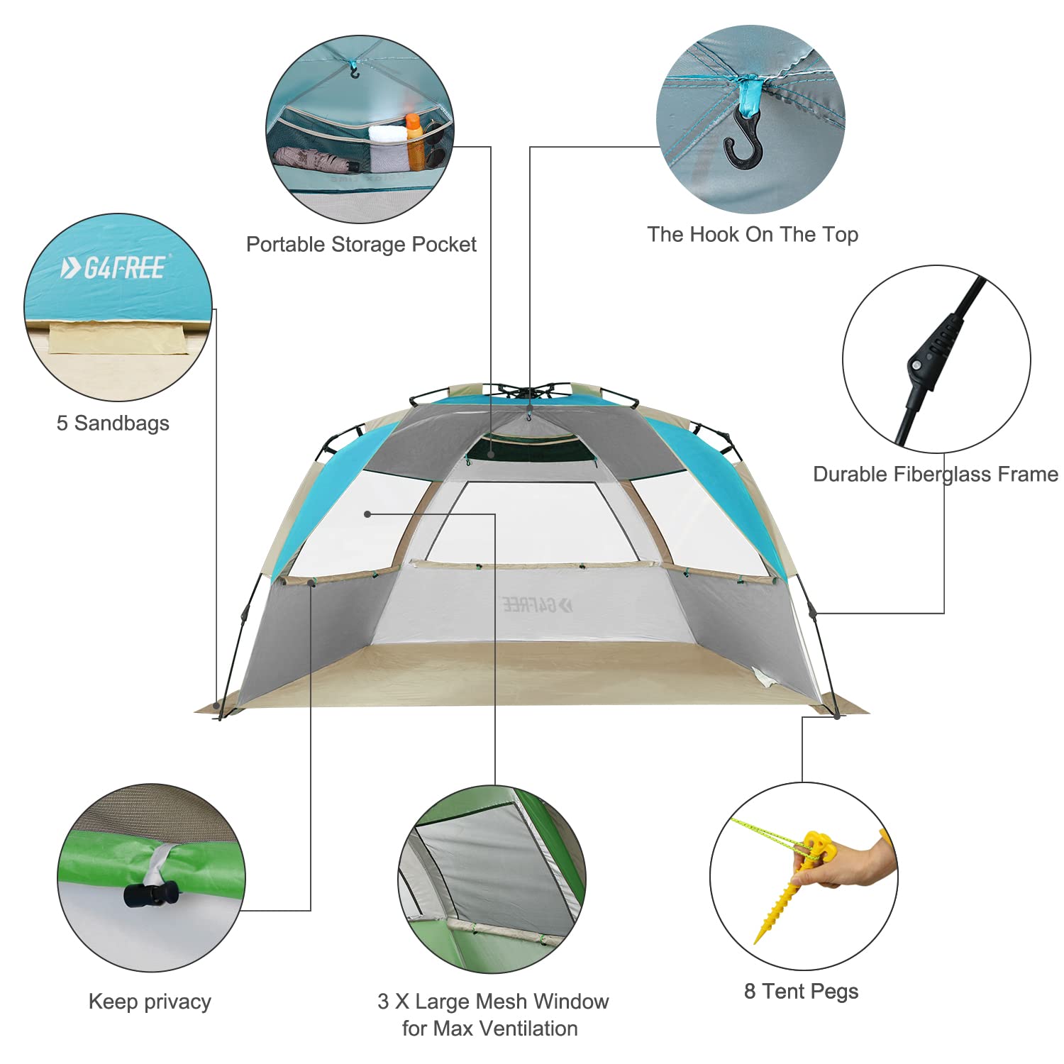 • 【Sturdy Structure & Windproof】Our Beach shelter features 5 built-in sandbags, rigid fiberglass, self-supporting tent structure, firm enough without the worry of collapse. Additional windproof ropes, stakes, and sandbags are also included, giving external force to reinforce the stability of the camping shelter, reliable enough to withstand wind blowing conditions.