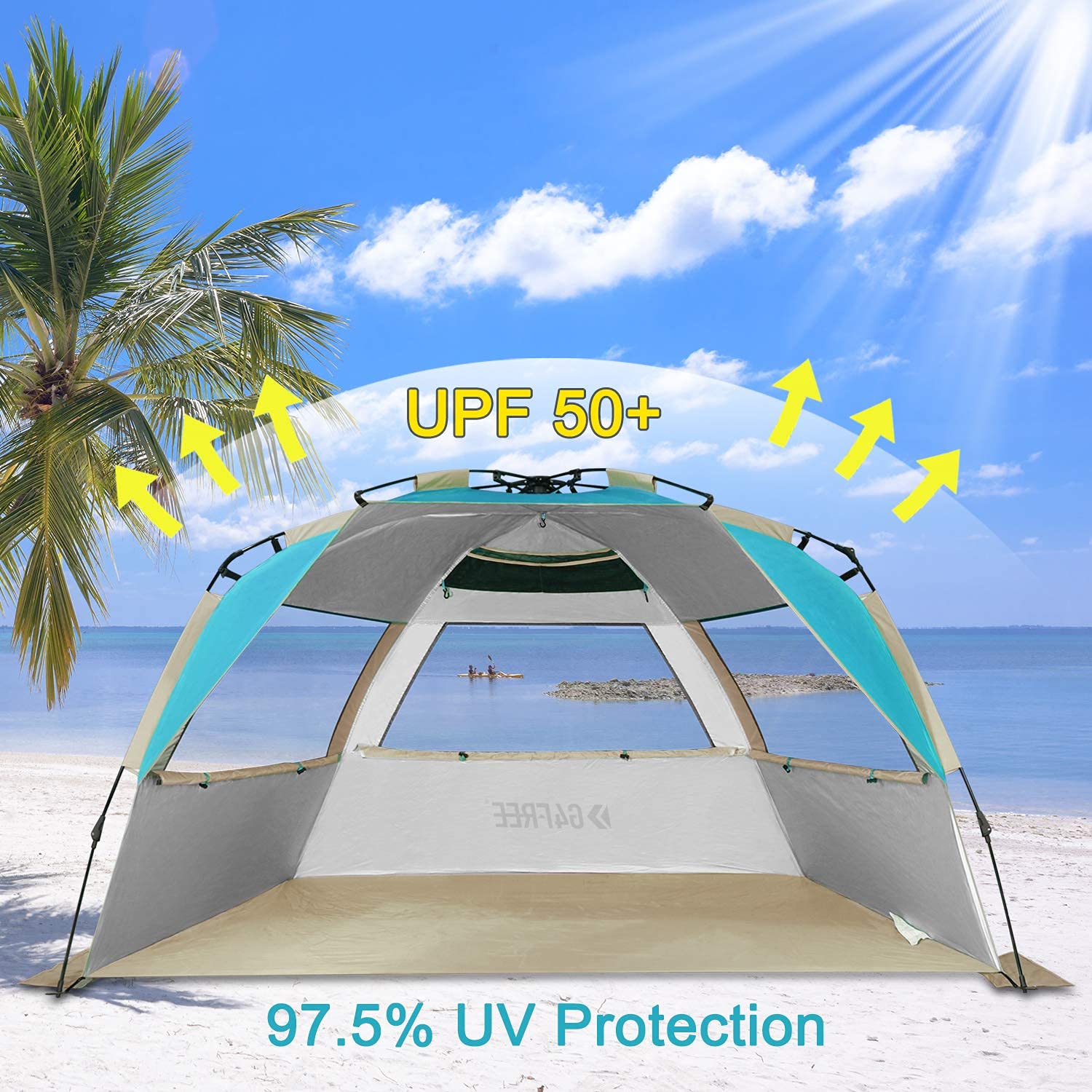 G4Free Easy Set up Beach Tent Deluxe XL, Portable Beach Shade 4 Person Pop up Sun Shelter UPF 50+ UV Protection Large Family Size(Lake-Blue)