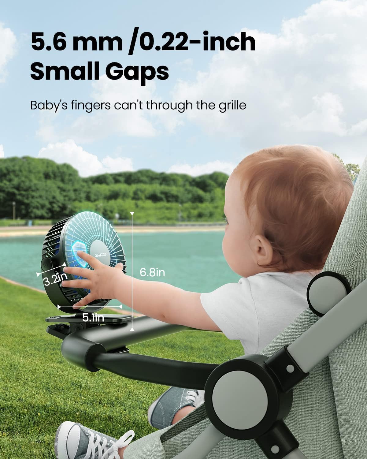 • Also Safe for Baby: The mini clip fan only has 5.5mm gaps, so it will protect the infant's little fingers from entering; While keeping toddlers safe, still works quietly and provides powerful wind
