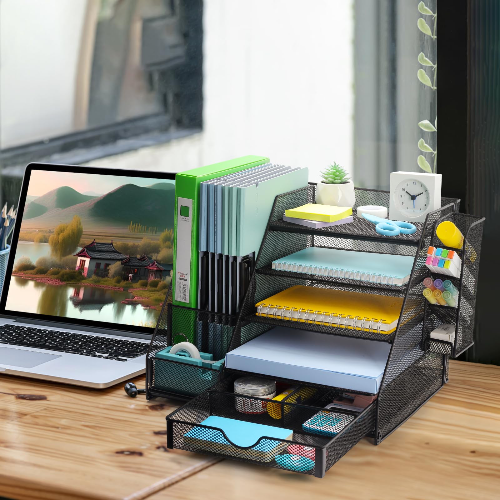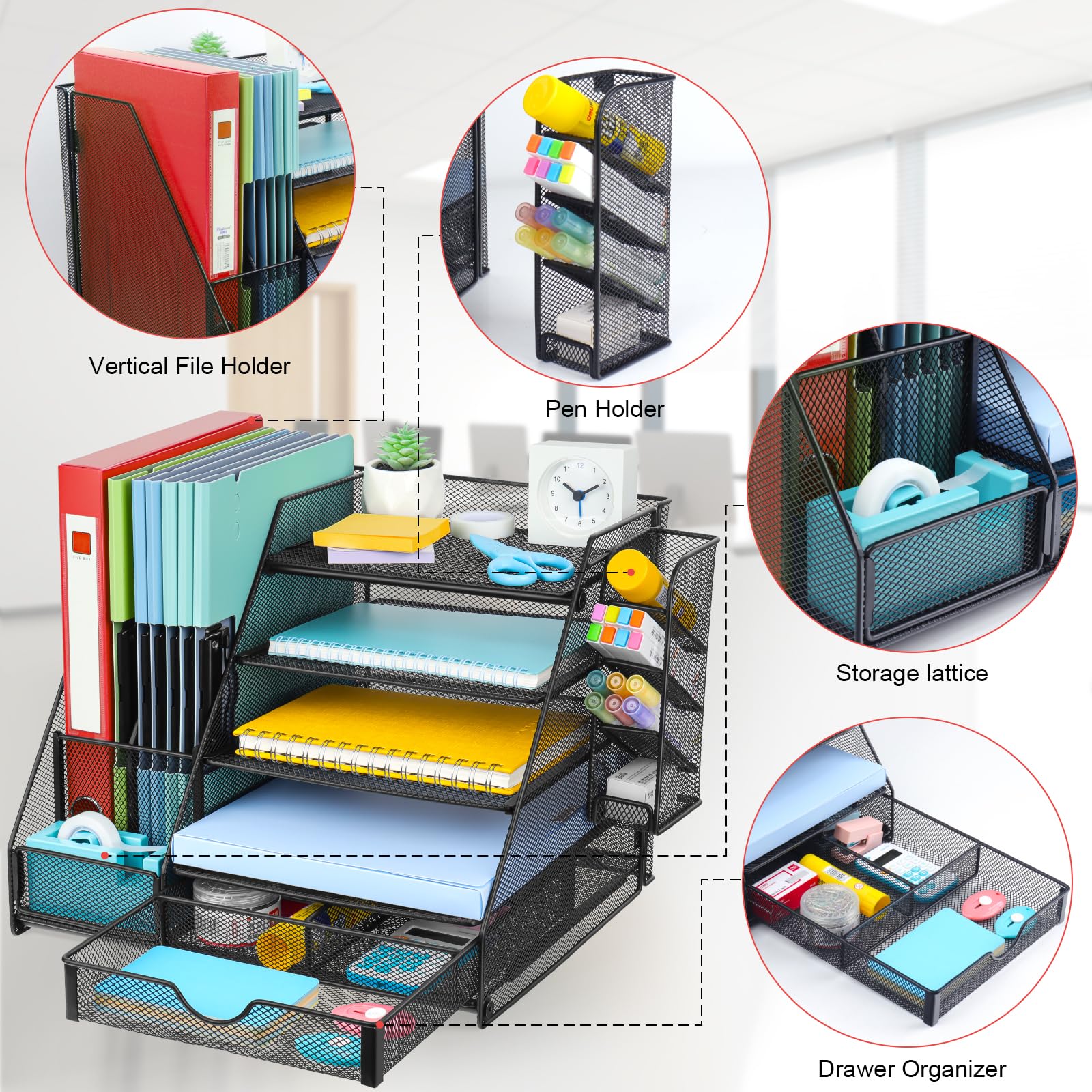 GALASALA Mesh Desk Organizer, 5 Tier Paper Letter Tray with Extra Vertical File Sorter, Sliding Drawer and Pen Holders for Desk Accessories Office Supplies, Black