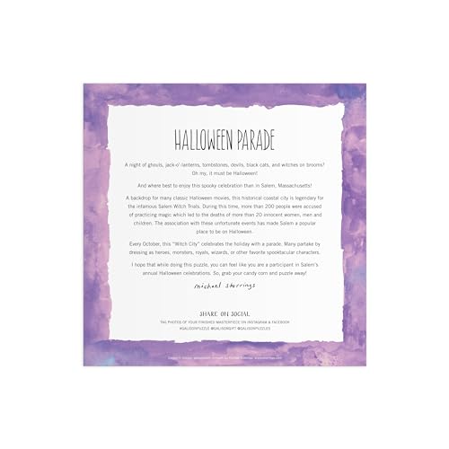 • 500 PIECE PUZZLE – Michael Storrings Halloween Parade 500 Piece Puzzle by Galison features the famous Halloween Parade in Salem, Massachusetts. This puzzle is just the right level of challenge for the whole family to join in on for hours of puzzling fun! The box includes an insert with the full puzzle image for reference.