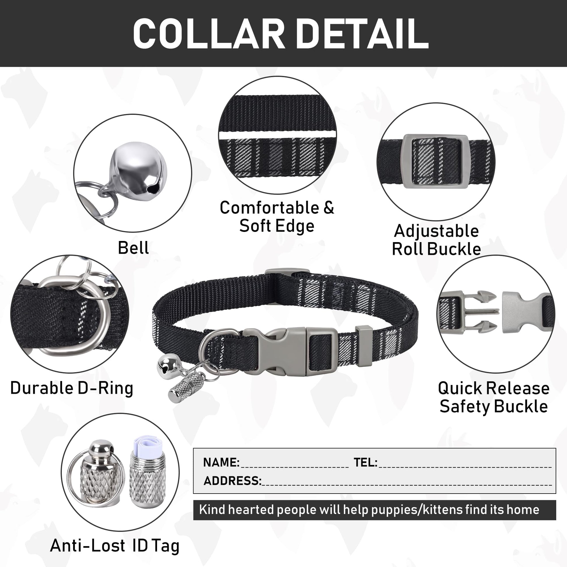 • DOG HARNESS, COLLAR AND LEASH: The package includes three items, a adjustable harness - care sheets, a collar, and a 5ft matching leash. The collar is with bell and ID tag, the leash is increase with a 360-degree rotation metal hook, and the harness is adopted with a quick release buckle and double D-rings which are very heavy-duty. You don't need to spend extra time looking through other accessories, but you get all of these items at the same time with less money! So this is a very cost effective option.