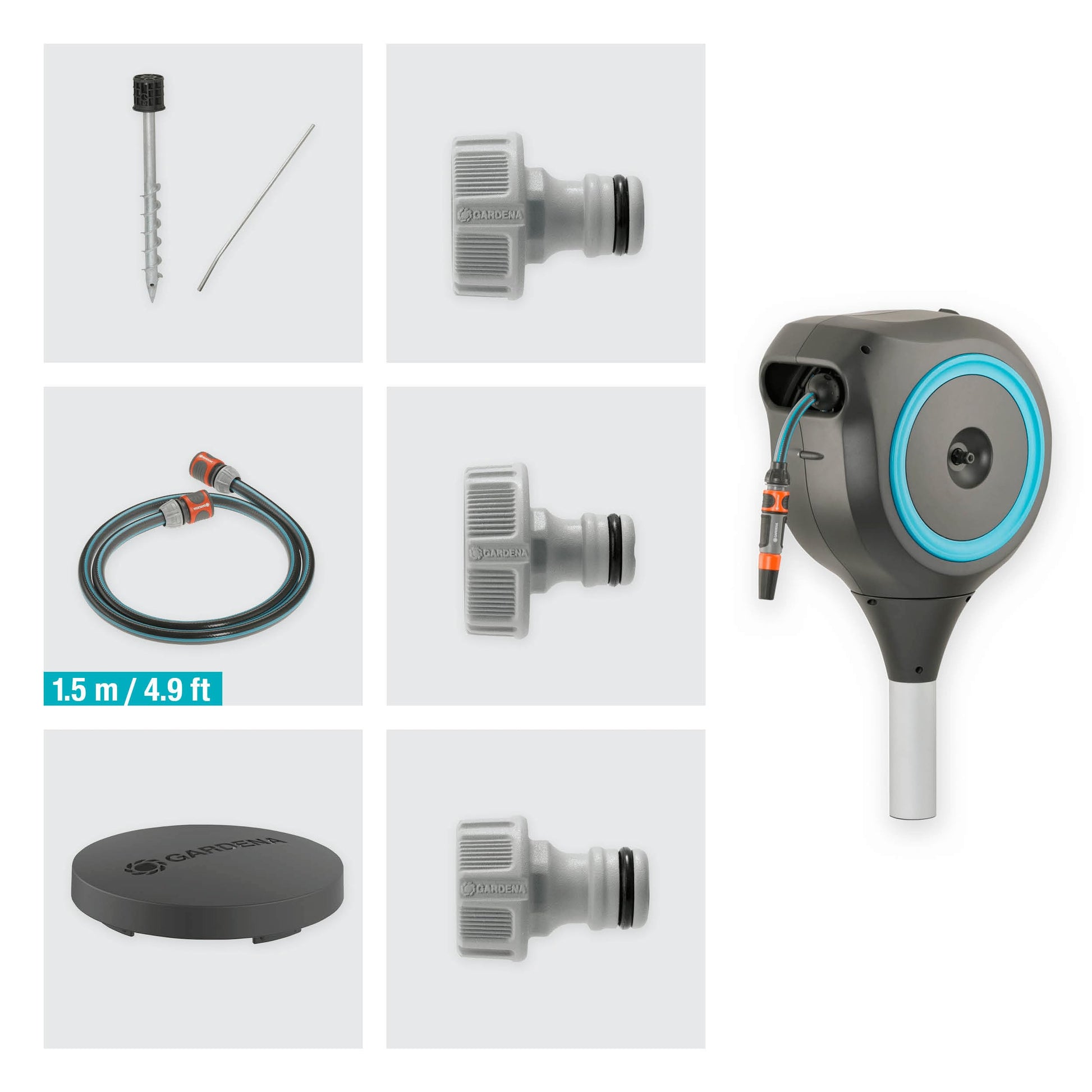 • Items delivered: 1x GARDENA Retractable Hose Reel, GARDENA premium hose, Metal spike, mounting rod, 5 ft connecting hose, connection fittings and infinitely adjustable spray nozzle