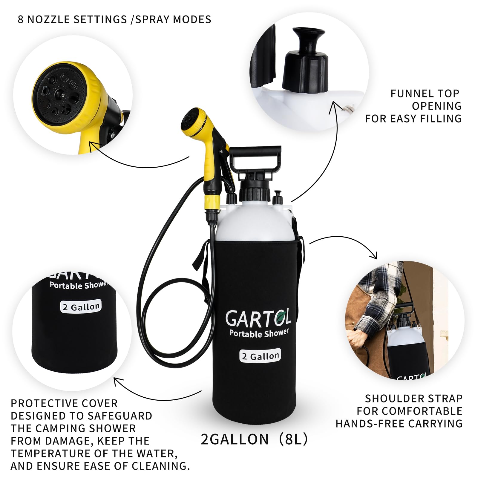 Gartol 2 Gallon Portable Shower with Handheld Showerhead, Silicone Bath Massage Brush, and Thermal Insulation Bag, High-Pressure Camping, Surf, Dog Shower Sprayer