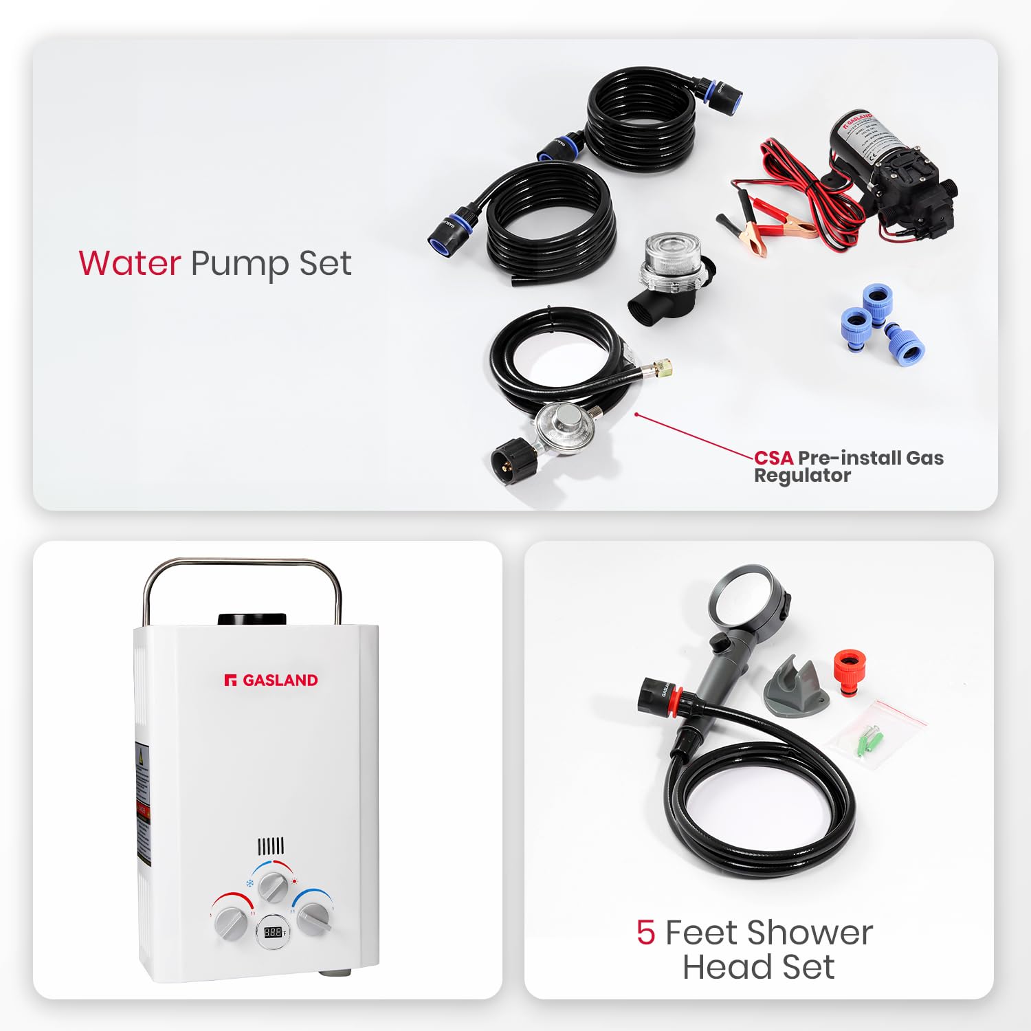 • [Package Contents] The package includes GASLAND BE158 tankless water heater, CSA-certified gas regulator and hose, 5-foot on/off switch shower head, 12v water pump, 1/2 inch Twist-on water strianer, mounting hardware, garden hose adapter, and instruction manual.