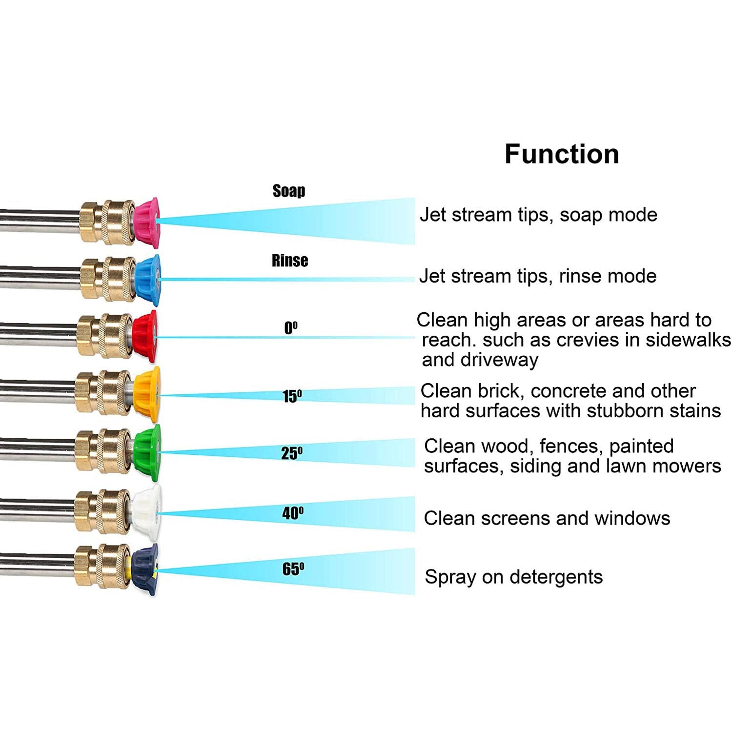 • Nozzle has 7 different spray angle : Meet your need in different situations, such as watering flowers and plants,Car Washing, floors,Windows washing Driveways Roofs Siding washing, and can be attached to a quick-connect wand for swifter application.so on Ideal for enthusiast or professional use.