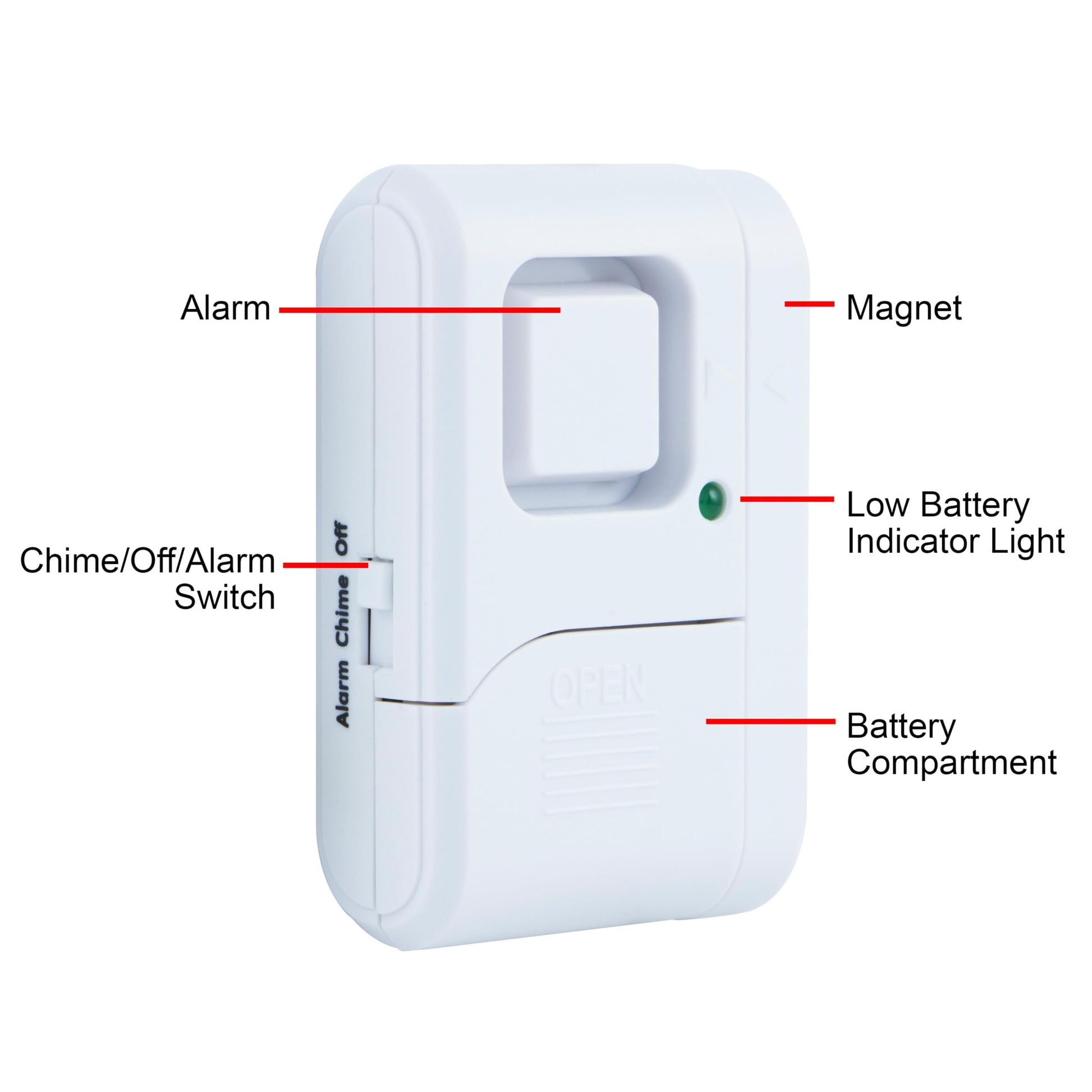 Details: The GE-branded Personal Security Window and Door Alarms provide a simple-to-use, cost-effective security solution to protect against home invasions. The 120-decibel alarms are loud enough to make a would-be intruder think twice about entering through your doors or windows. Each alarm features an easy-access CHIME/OFF/ALARM switch — this straightforward design makes your security setup intuitive and streamlined. With no wires required for installation, protecting an entry point is as easy as mounting the alarm using the included double-sided tape. When a door or window is opened the alarm’s base becomes separated from its magnet, triggering a gentle chime or ringing alarm. Powered by 4 LR44 batteries (included), the LED indicator on the front will notify you when power is low. This set of GE-branded Personal Security Window and Door Alarms are perfect for homes, apartments, dorm rooms, offices, RVs, campers and much more.