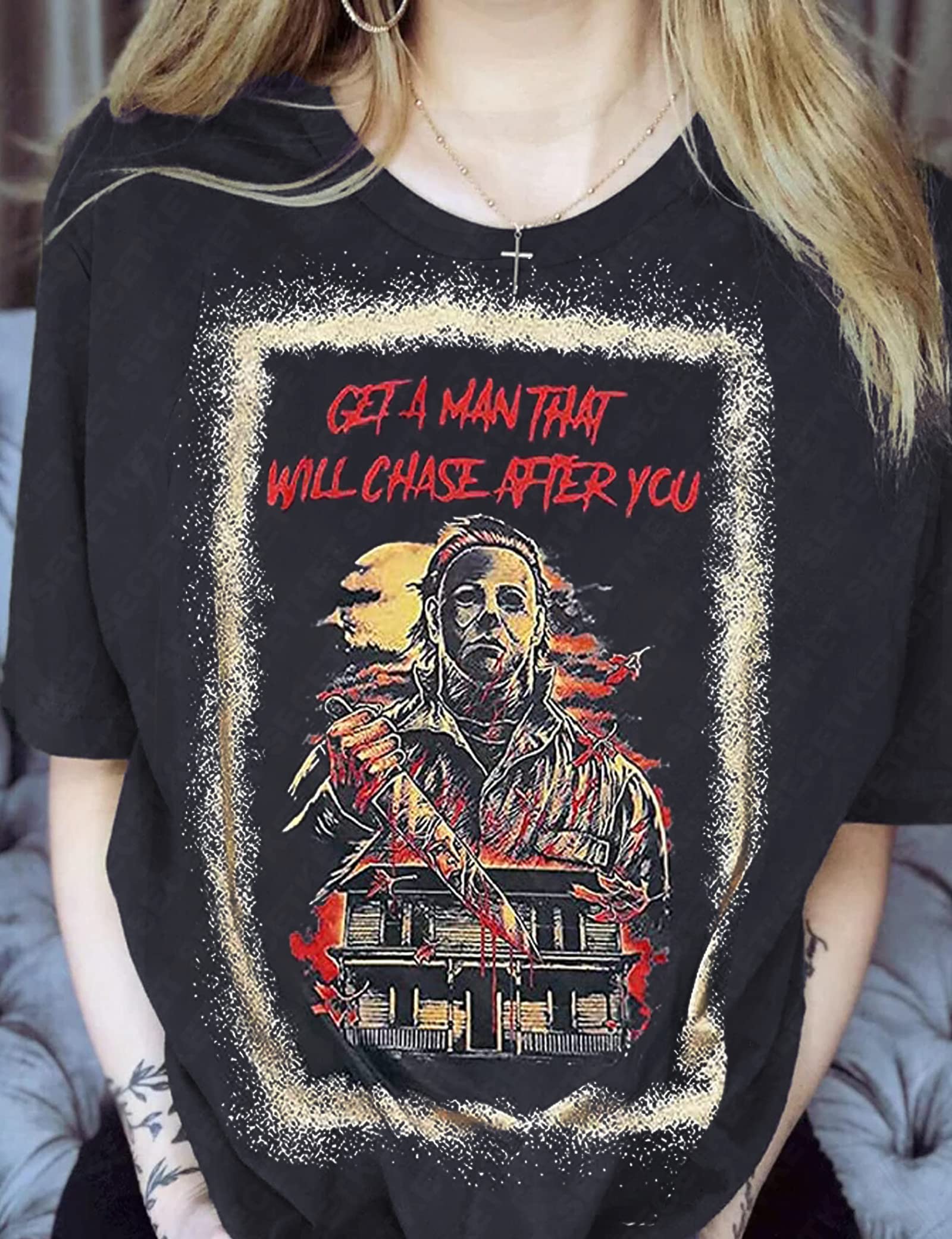 Get A Man That Will Chase After You Halloween Bleached Shirt Women Horror Scary Movies Michael Myers Jason Graphic Tees (Black, X-Large)
