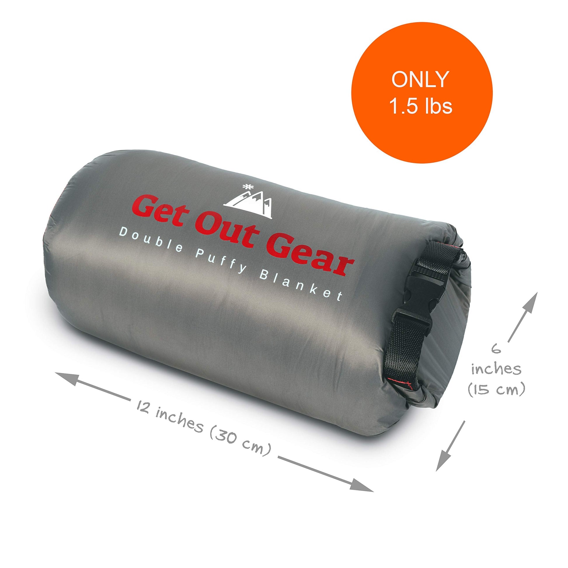 Get Out Gear Double Puffy Camping Blanket - Extra Puffy, Packable, Lightweight and Warm | Ideal for Outdoors, Travel, Stadium, Festivals, Beach, Hammock | Water-Resistant Camp Quilt (Teal Blue/Gray)