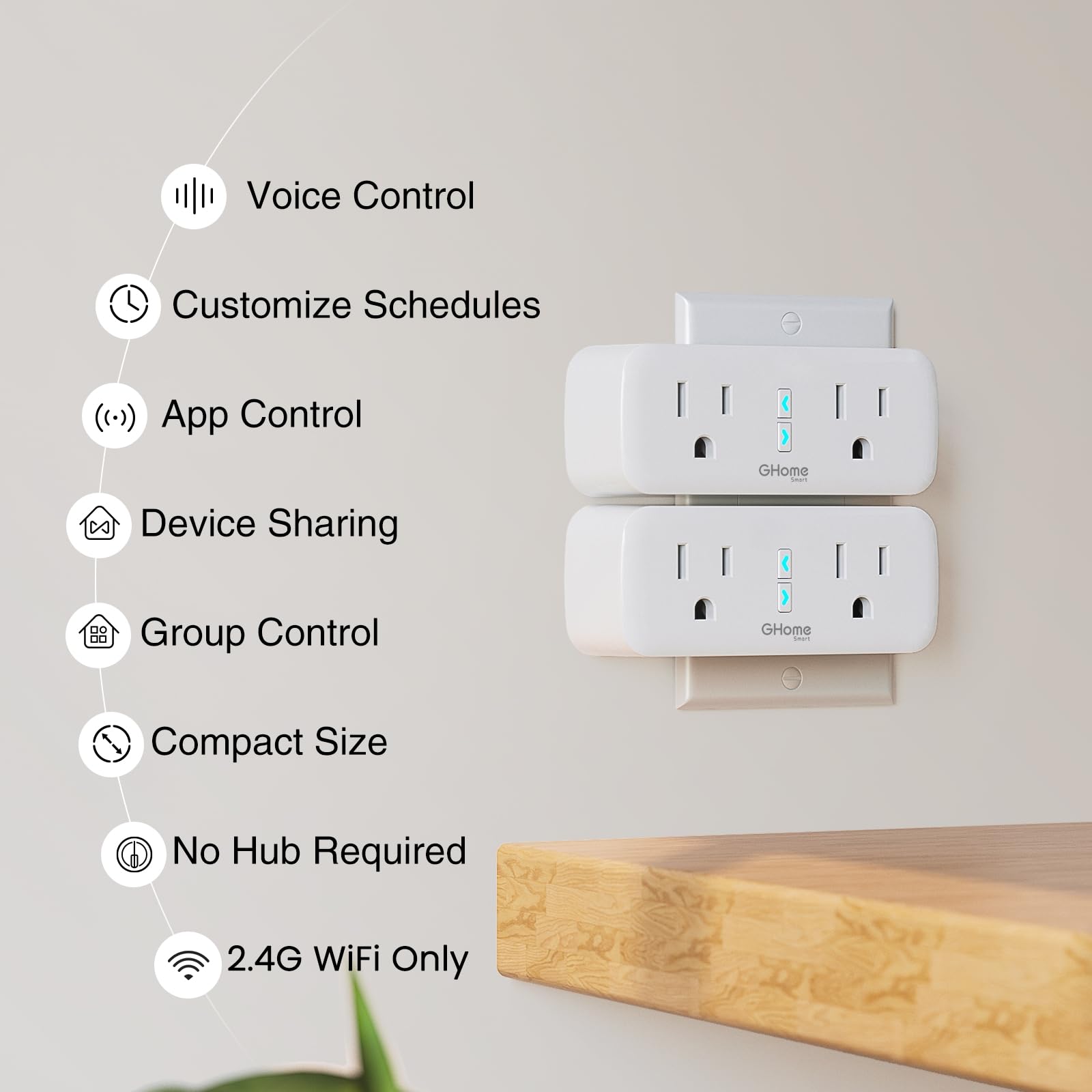 GHome Smart Plug, 15A WiFi Smart Outlet Compatible with Alexa & Google Home, Smart Surge Protector with Remote Control & Timer, Dual Sockets, No Hub Required, 2.4GHz WiFi Only, White, 2 Pack