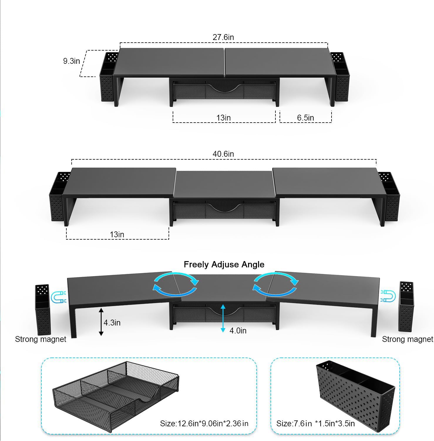 • 【Ample Storage Space】The dual monitor stand features two magnetic pen holders and a drawer, allowing you to easily organize your desk accessories and office supplies, keeping your workspace clear and tidy for easier access.