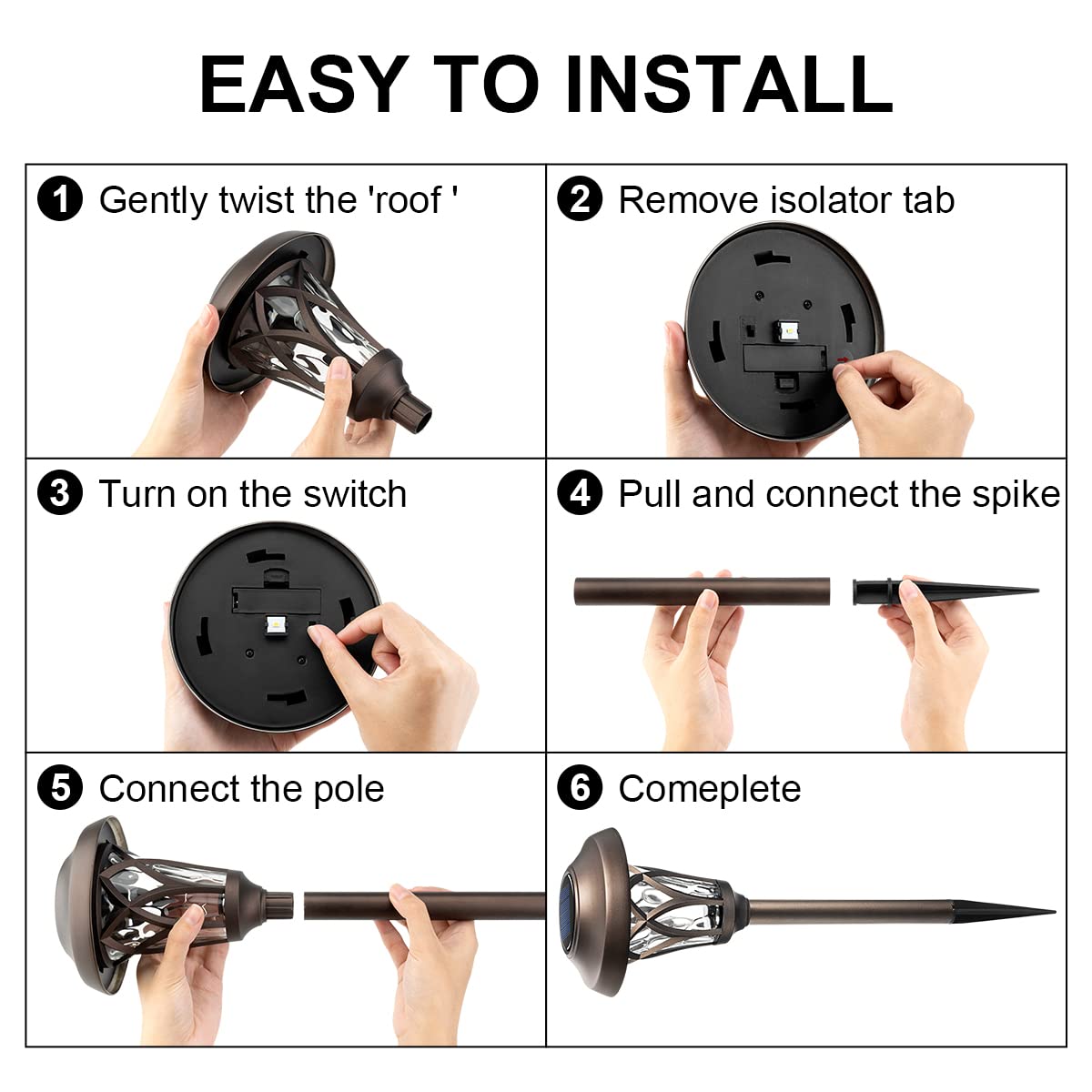 • 【Easy installation】Wireless setup and operation via solar walkway lights. Remove the isolator tab under the cap, turn on the switch, install the pole and stake, then insert the light into the soft ground.