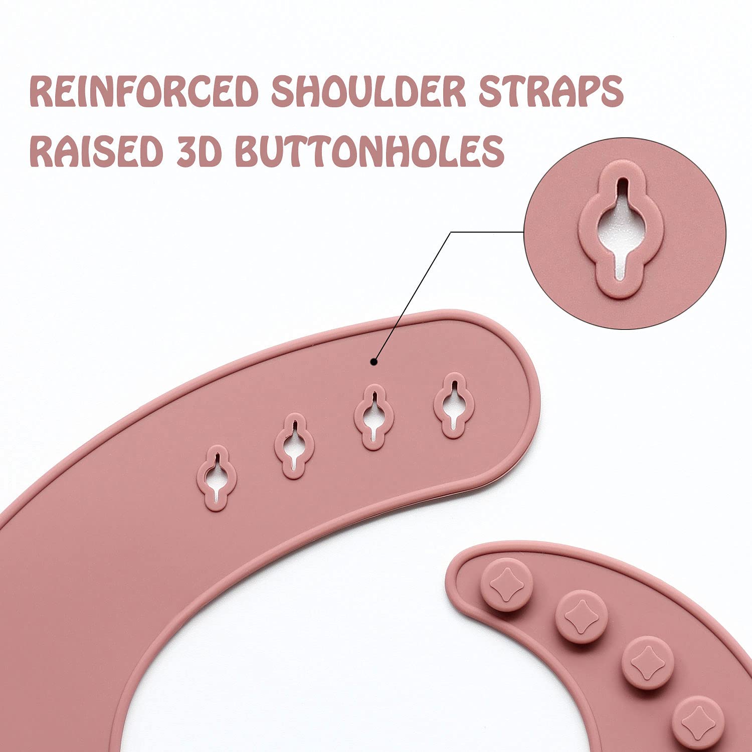 • STAYS ON WELL & FREE FROM WORRY – The reinforced shoulder straps with raised 3D buttonholes & fasteners could make sure the silicone baby bibs will NOT be ripped off by toddlers during the meal. The raised 3D buttonholes are NOT easy to be torn apart by babies.