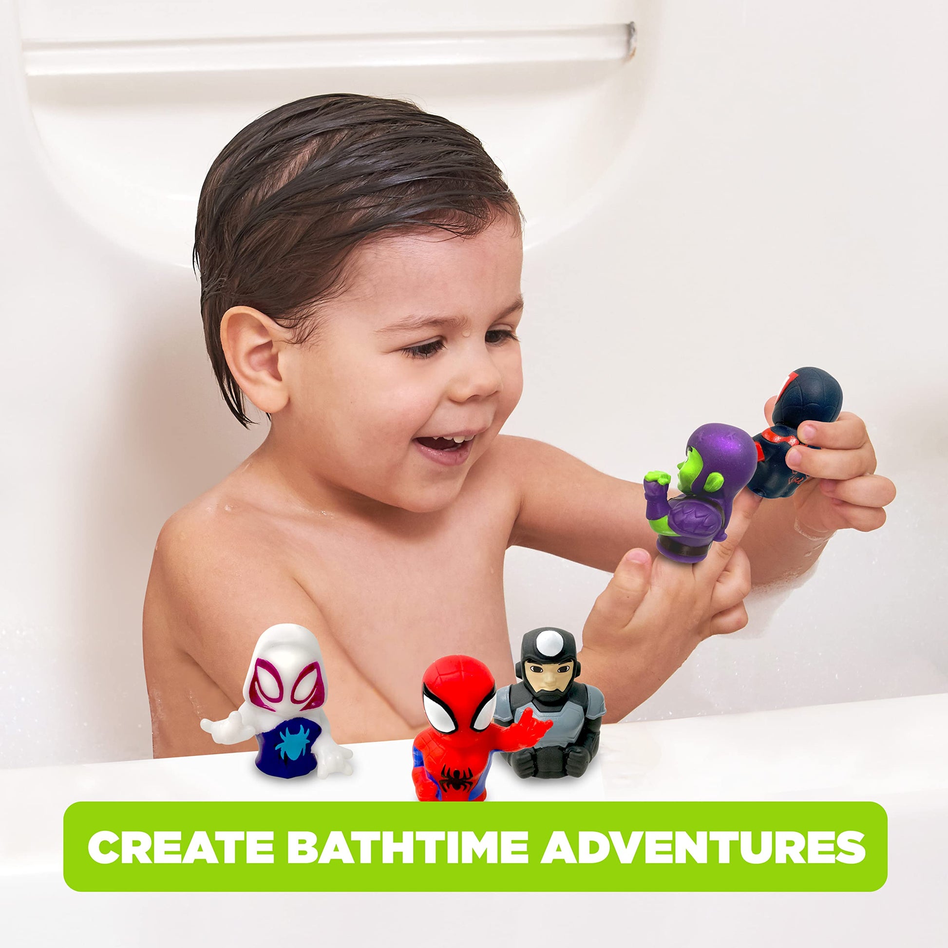 Details: Team up with these web-slinging friends for Bath Time Adventures! These Spidey and His Amazing Friends 5 Piece Bath Finger Puppets are a bath time essential for little ones. Designed with little hands in mind, simply slip these tiny puppets over any finger to bring the superheroes to life! Perfect for in the bath & out, these finger puppets make for an excellent educational resource- aiding in teaching your child colors, counting, and more! Since they are fully waterproof, bring them to the pool or the beach for an aquatic adventure with friends. Crafted with soft, thick, and durable PVC, each puppet is designed to hold up playtime after playtime. For parents, the possibilities are endless for these puppets- they make for perfect party favors and great gifts. When springtime rolls around, use them to help fill your child’s Easter basket or as a surprise inside an Easter egg! During the holidays, these puppets are a spectacular stocking stuffer or a heartfelt Hanukkah gift. This pack of five includes 1 Spidey, 1 Ghost Spider, 1 Miles, 1 Rhino and 1 Green Goblin! Watch your child’s imagination soar as they use these puppets for playtime, bath time, story time, and more!