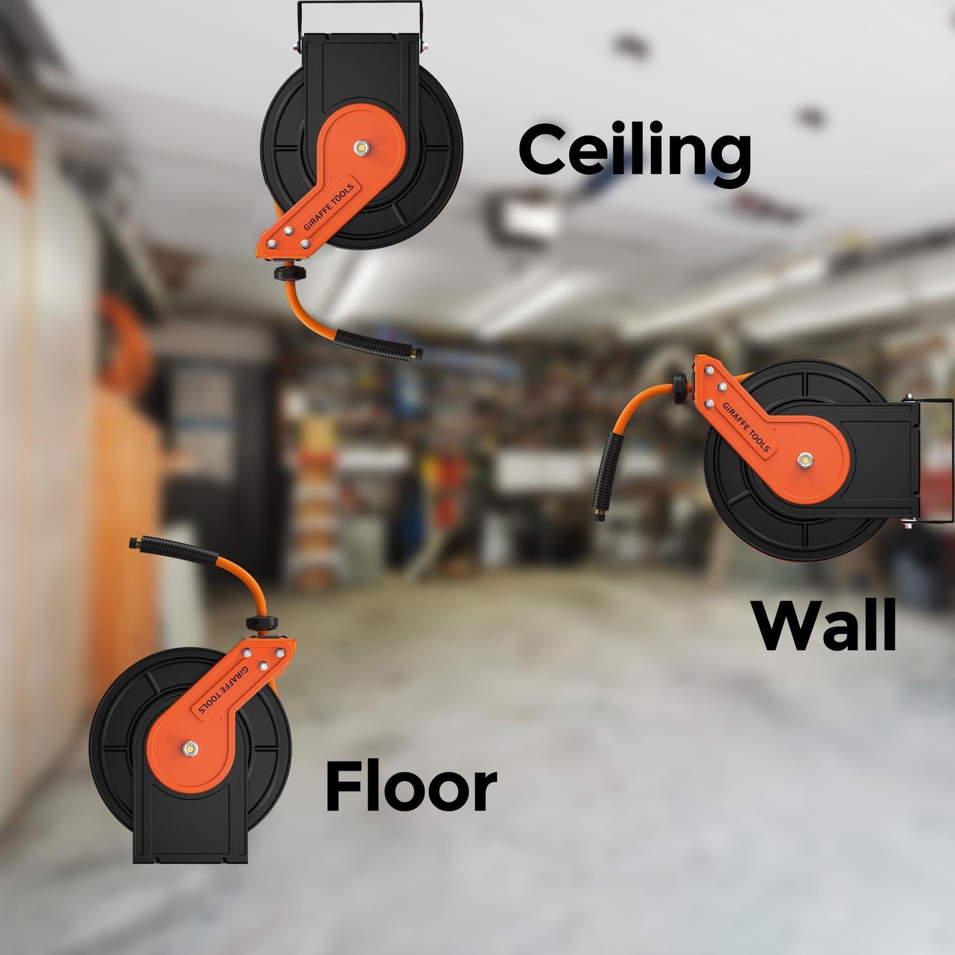 Giraffe Tools TA15BPLUS Retractable Air Hose Reel with Swivel Bracket 3/8" x 50 ft Hybrid Hose, Ceiling/Wall Mounted Heavy Duty Industrial Air Compressor Hose Reel, 300PSI, 50ft