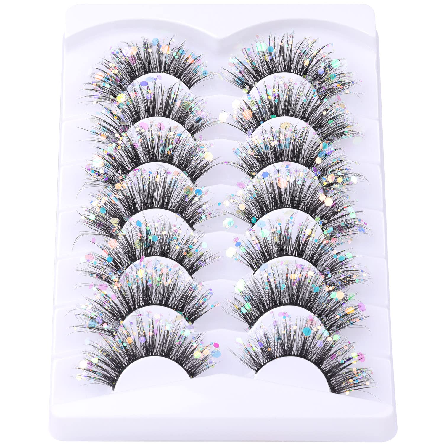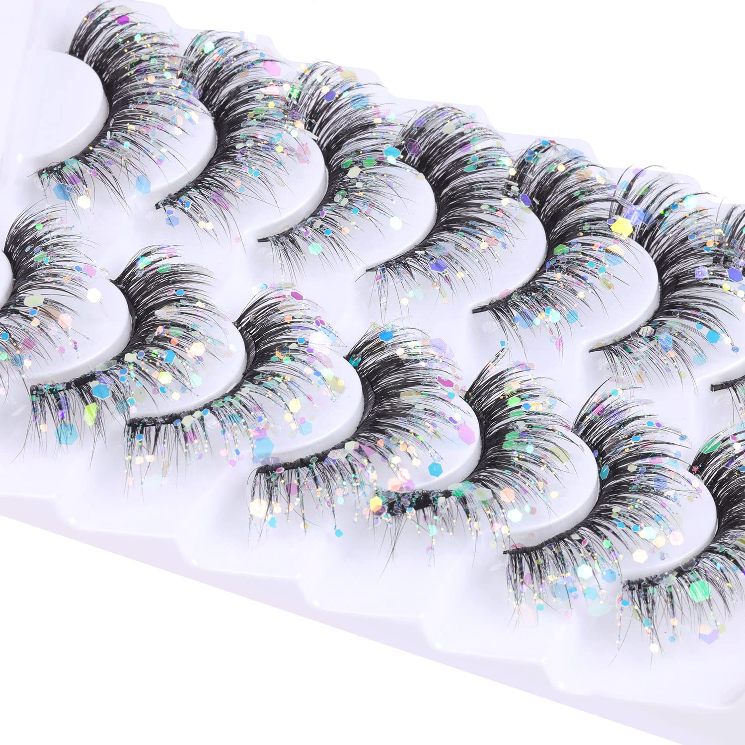 Glitter Lashes Dramatic False Eyelashes with Shinny Glitter Decorative Colored Lashes Glow in the Dark Faux Mink Eyelahses Cat Eye Strip Lashes Pack 7 Pairs