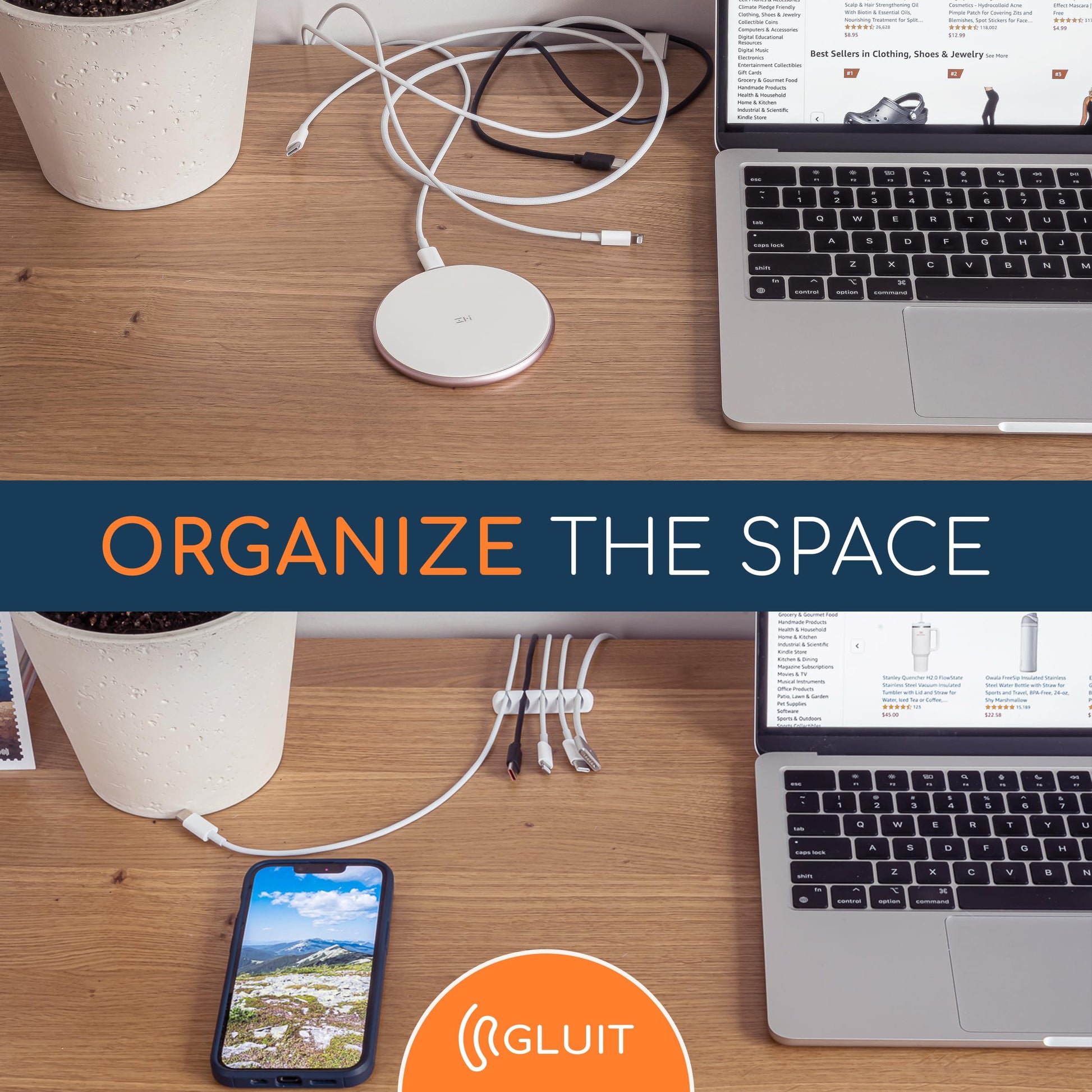 • Wide Compatibility: GLUIT's cable management system accommodates diverse cable types like phone chargers, USB, power, Ethernet, and audio cables, ensuring a tidy and organized workspace. Sleek & GLUIT's desk cable holder feature a modern, minimalist design that keeps cables neat while enhancing any desk or office décor. Elevate your workspace with this functional