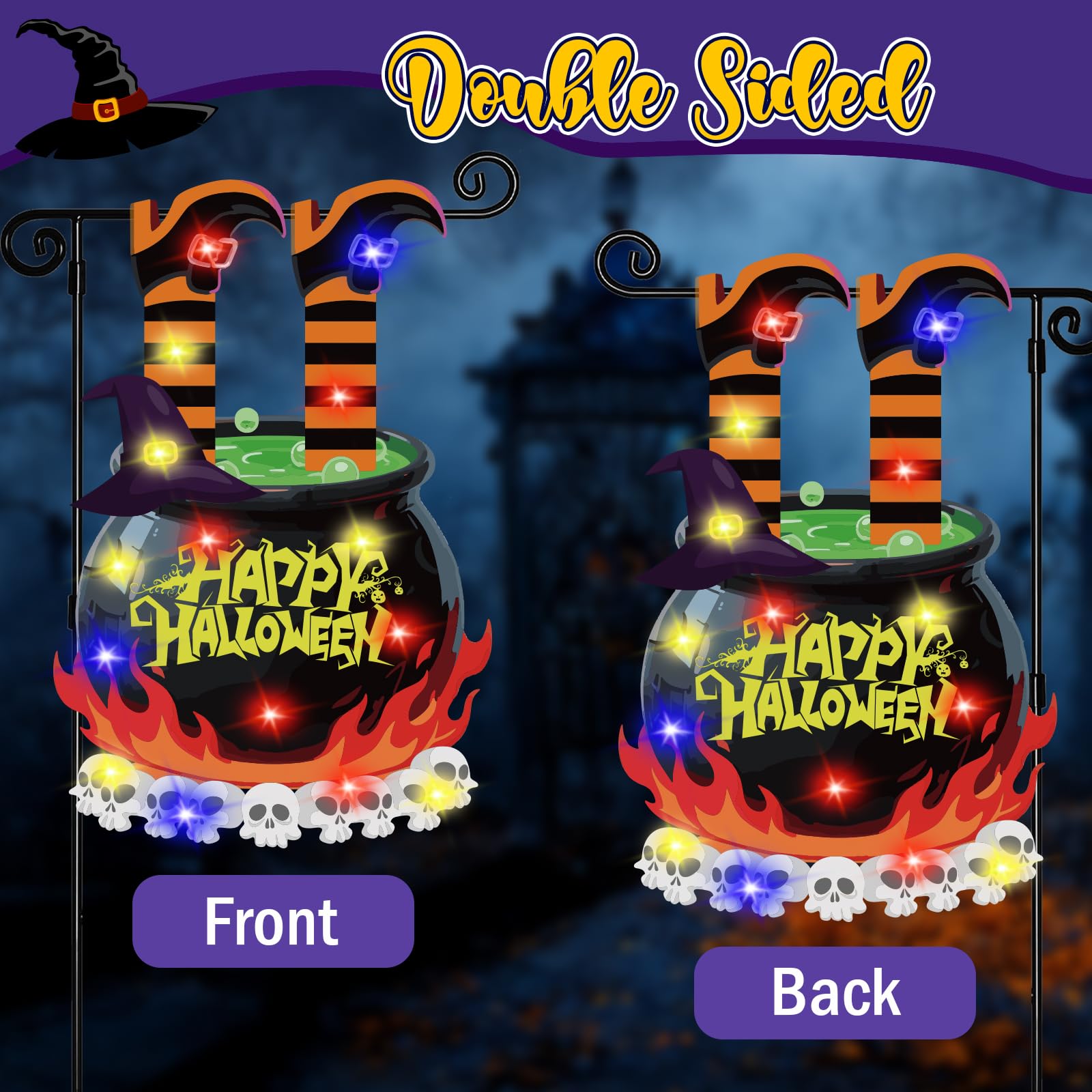 GOAUS Halloween LED Garden Flag Light Up Solar Powered, Witch Cauldron Decorations Outdoor, Double Sided Oxford Decorative Flag for Lawn Yard Outside Decor, 12x18 Inches