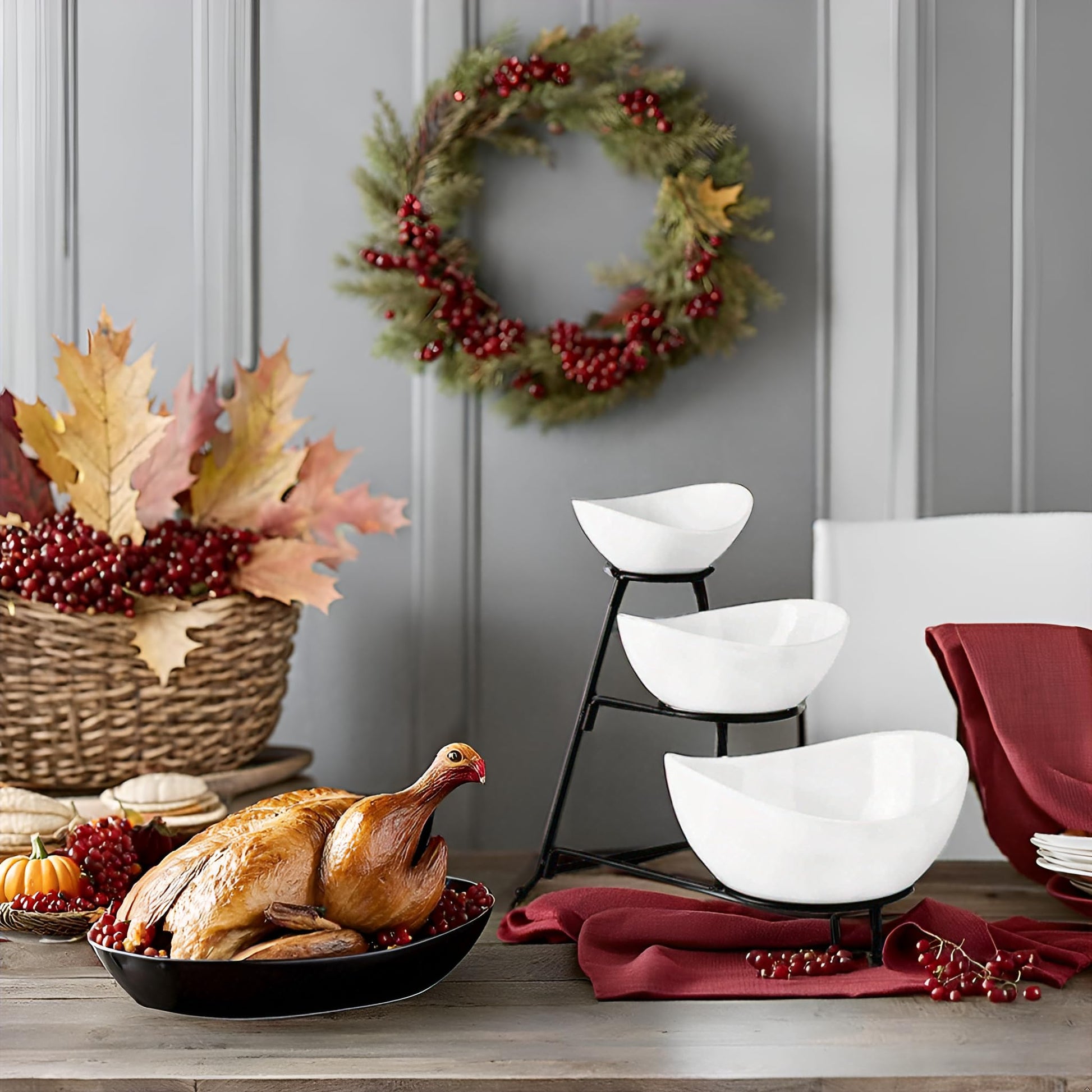 • EASY TO DISASSEMBLY AND CARE: This 3 tiered bowl stand consists of 1 metal and 3 porcelain oval bowls, collapsible and very easy to set up and disassemble. Bowls are made of high-grade porcelain. They are also easy to clean and care for. These 3 porcelain bowls are Dishwasher, Oven, Freezer, and Microwave safe, but the metal rack is not, please don't put them in the Oven or Microwave.