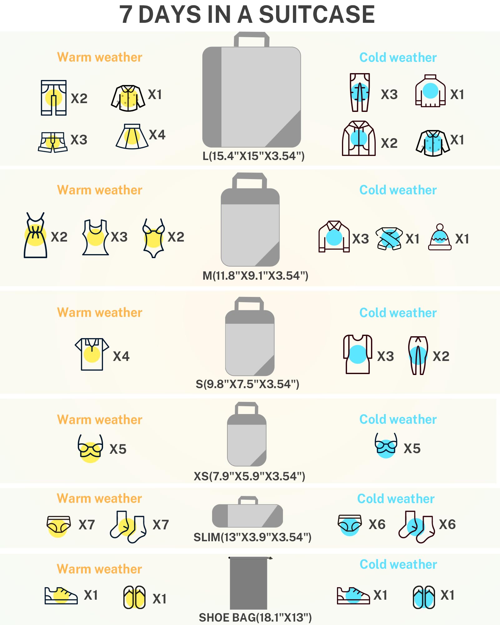 • Set Includes: 1*Large (39x38x9 cm /15.4x15x3.54 inches), 1*Medium (30x23x9 cm /11.8x9.1x3.54 inches), 1*Small (25x19x9 cm /9.8x7.5x3.54 inches) , 1*Smallest (20x15x9 cm /7.9x5.9x3.54 inches), 1*Slim (33x10x9 cm /13x3.9x3.54 inches), and 1*Laundry bag (46x33 cm/18.1x13 inches)