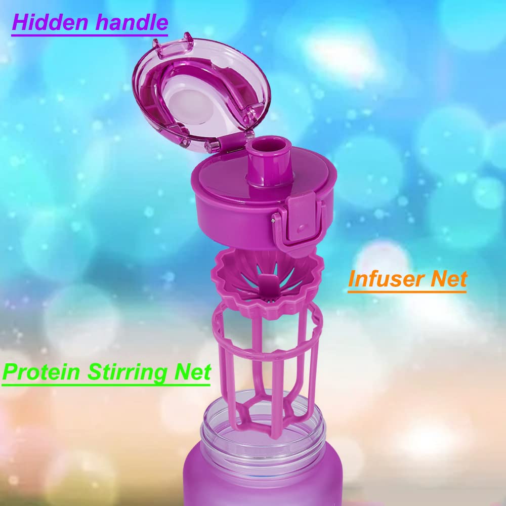 • 【FUNCTIONAL DESIGN】 - One-touch button easy opening, unique mouth opening (for fast water flow ,ice adding, easy cleaning), concealable handle (for easily carrying in outdoor travel),removable strainer (infuse fruit & tea),removable stirring net (stir protein powder and other powders) and other functions make this water tracker bottle your favorite fitness partner! With a unique silicone sealed ring, it’s leak proof and dust proof and you don't have to worry about water leakage when using it.