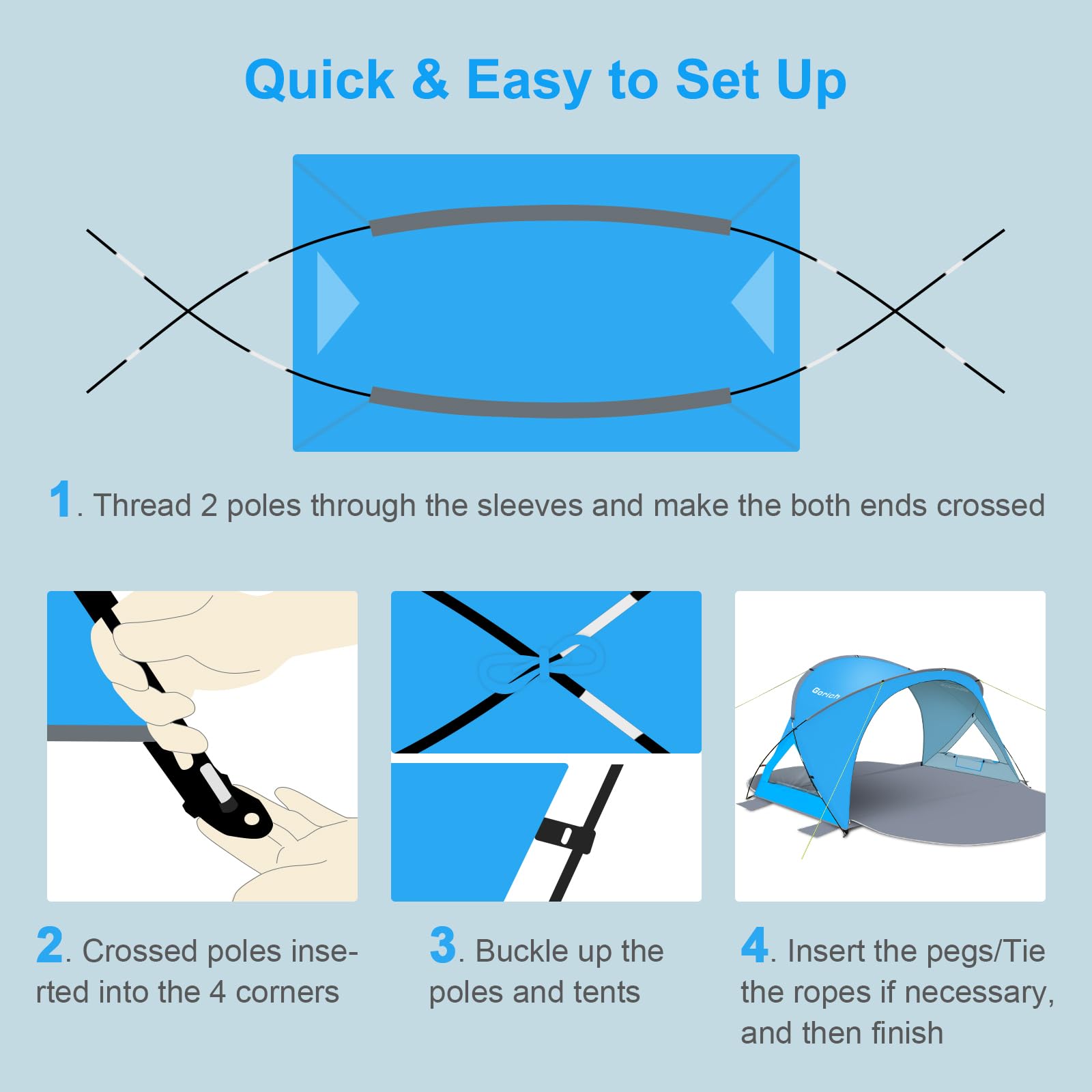 • Stable and Durable Construction: Equipped with sturdy 8mm thickened poles, 4 sandbags (2 on each side), 8 stakes (including 4 ground stakes and 4 plastic stakes), and 4 wind ropes, the tent can withstand 3-4 level wind forces to remain stable and secure, ensuring reliable windproof performance for your beach adventures