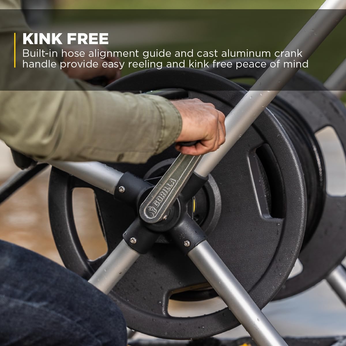 Details: The all-new Gorilla 225 ft. Zero-Rust Mobile Hose Reel is built to last and designed to withstand years heavy duty use and all weather conditions. With a high-strength anodized aluminum frame, forged brass fittings, high impact blow molded reel and a cast-aluminum crank, this hose reel is extremely durable and easy to use, won’t rust, and is backed by a 7-year manufacturer's warranty. The upright comfort handle and 7 in. over-molded wheels are designed to give you the maneuverability you need on any terrain and the wide base provides great stability. Easy access connections, torque-tight fittings and hose alignment guide simplify the loading and unloading of up to 225 ft. of hose. The handy removable tray provides space for accessories like additional nozzles. The Gorilla Mobile Hose Reel is the perfect, long-lasting solution for any home.