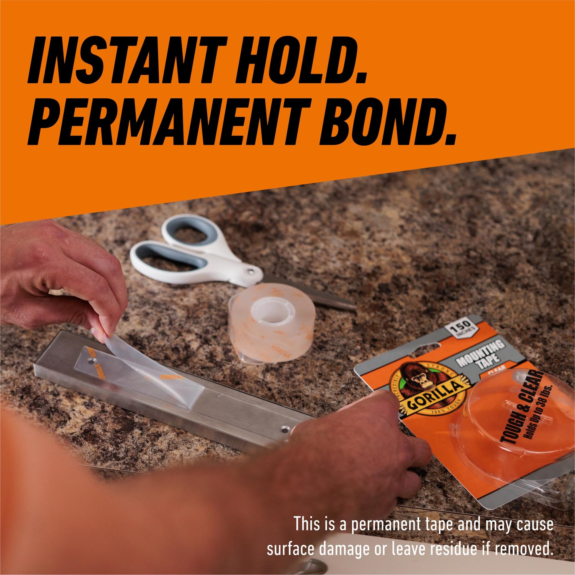 Details: Gorilla Tough & Clear Mounting Tape (pack of 1) is a clear double sided tape that mounts in an instant; for a long-lasting; weatherproof bond. The crystal clear tape won’t yellow over time; and holds up to 38 pounds. Gorilla Tough & Clear Mounting Tape is perfect for indoor and outdoor projects and sticks to smooth and rough surfaces. Completing DIY projects are easy with this single pack of tough; strong double sided tape. Mount; build; and repair for a perfect finish; every time. Adhesive tape for wall hanging; bonding odd objects; or mounting heavy objects. Directions: Apply tape to back of object vertically; allowing for even distribution of weight. Avoid touching surfaces of the tape. Note: Apply 4” of tape per 1lb of weight. Cut the tape and press to secure the tape to object. Remove clear liner and align objects to desired placement. Press firmly; as heavy duty tape conforms to the surface and creates a strong; Permanent bond. Once Heavy Duty Mounting Tape is used to mount an object; it is meant to be held in place permanently; and not be removed. Double sided tape for walls and windows alike. Double sidestick tape sticks to almost any indoor or outdoor surface. Follow the Gorilla link at the top of this page to see other quality products from the Gorilla Glue Company.