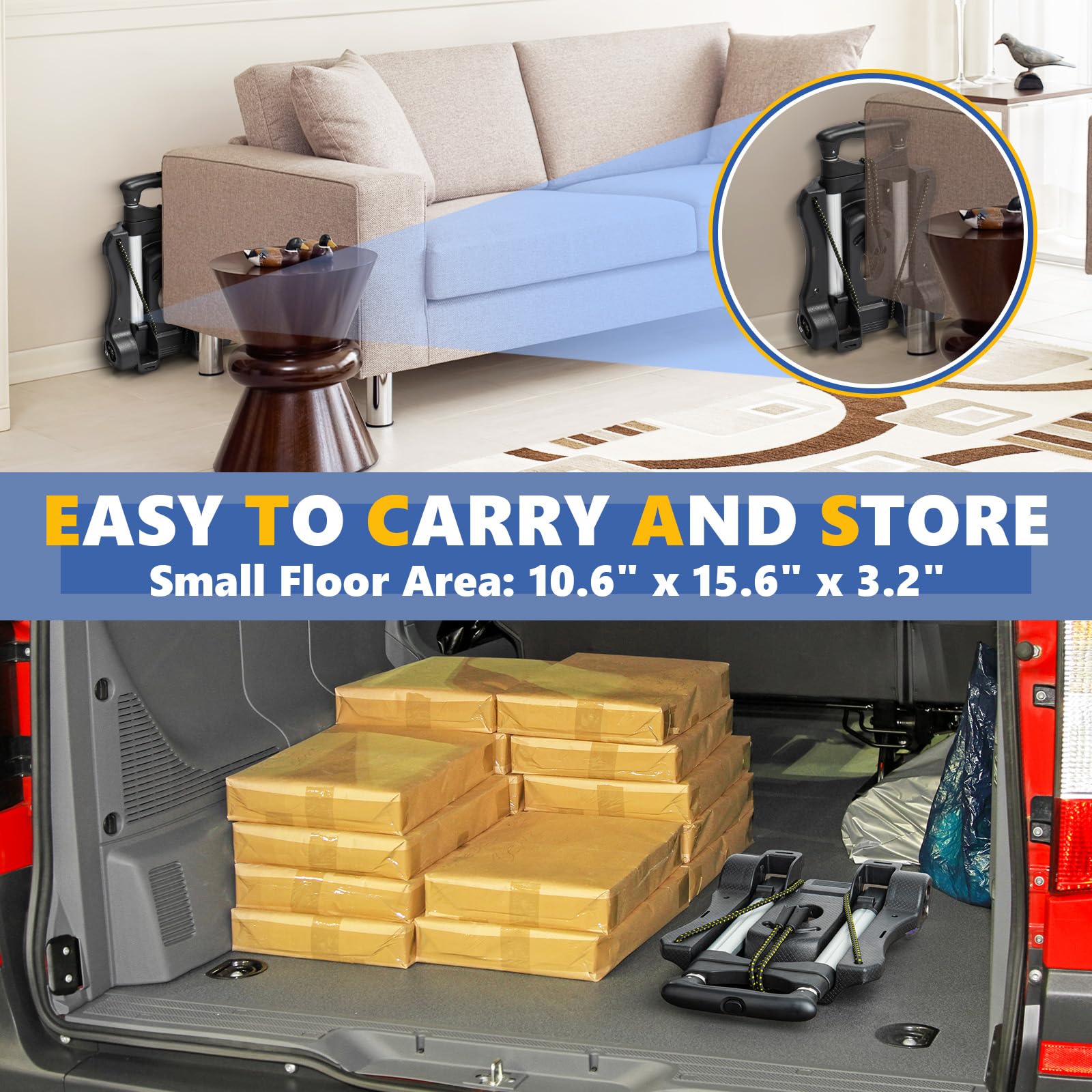 • 【Compact Size for Easy Storage】- The small hand truck foldable weight is only 2.8 lbs and folds up easily. When opened, its size is 37.4' × 10.6' × 11.8'. The Size of the Portable Hand Truck is only 3.2' × 10.6' × 15.6' when Folded, making it very compact. You can easily fit the hand truck dolly foldable into a car trunk or even a backpack.