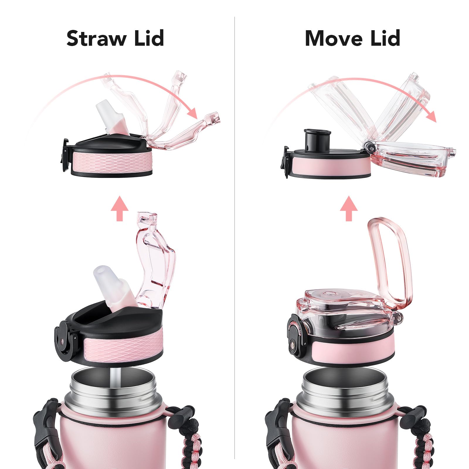 • Insulated water bottle 24 oz: 24 oz insulated water bottle has a matte finish and comes with 2 lids (Lid with Straw/No Straw) and a Paracord handle for easy portability; Its wide mouth makes it easy to fill, pour, and clean, and the leak-proof cap ensures worry transport.