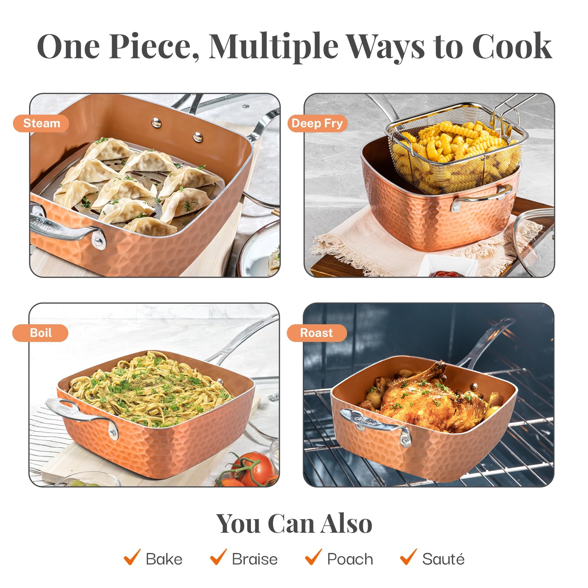 • SQUARE DEEP-FRYING PAN SET: Rely on this deep-frying pan set for all your daily cooking needs. This set includes a 9.5-inch square deep-frying pan with glass lid, a frying basket, and a stainless-steel steamer tray, providing quality cookware for you to fry, stir fry, and steam foods, braise and sear meats, cook vegetables and more.