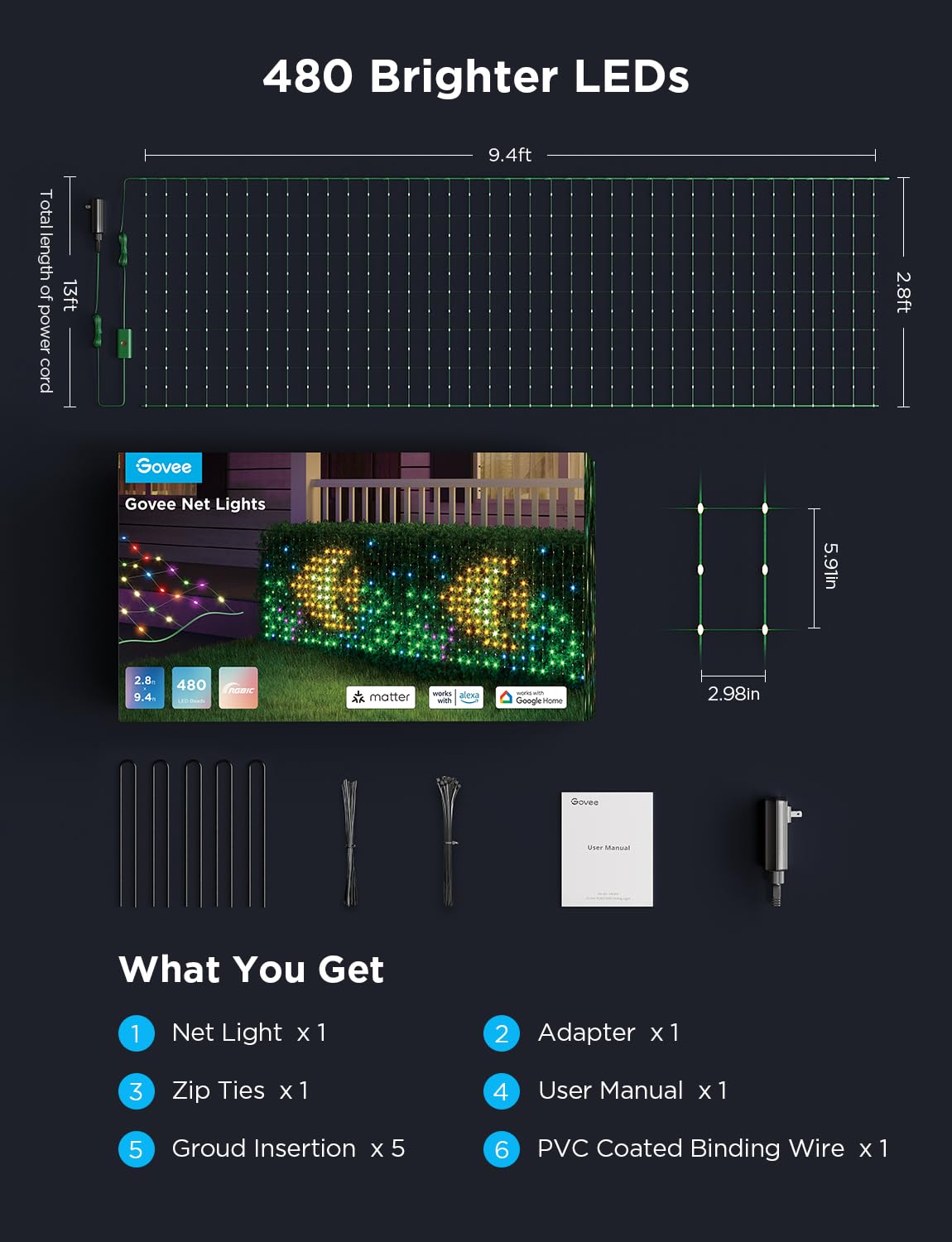 Govee Outdoor Net Lights, 2.8 × 9.4ft with RGBIC and DIY Functions, 480 LEDs Smart Net Lights with 64 Modes for Bush Patio Decor, IP65 Waterproof, Compatible with Alexa & Google Assistant, Green Wire